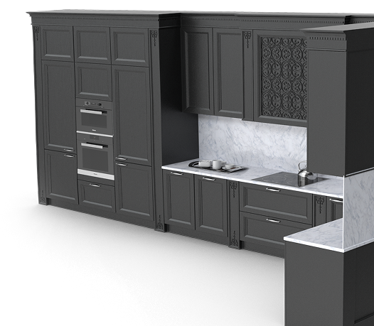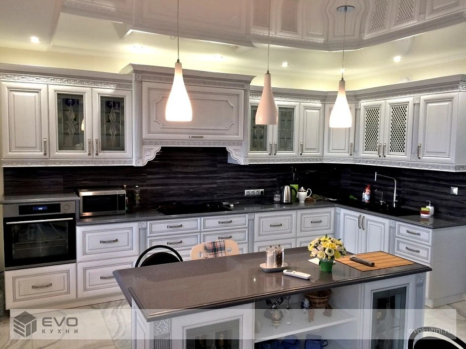 Г-образный гарнитур в этом стиле имеет фасады с легкой фрезеровкой, благородные нейтральные оттенки и натуральные материалы. В современной классике преобладает симметрия и массивные элементы – карнизы, пилястры, остров.