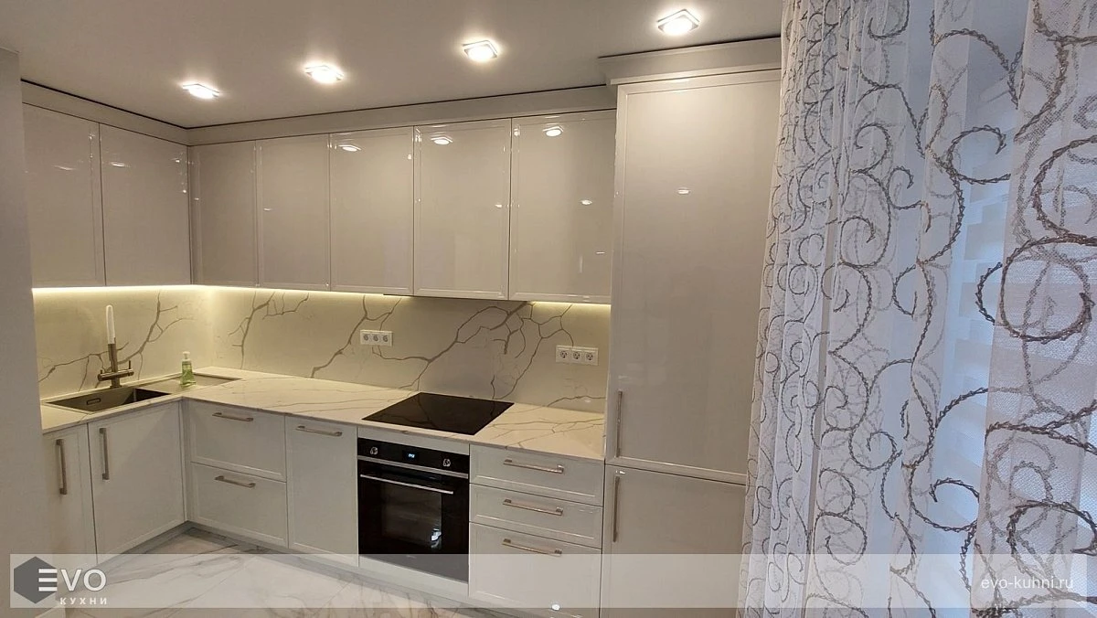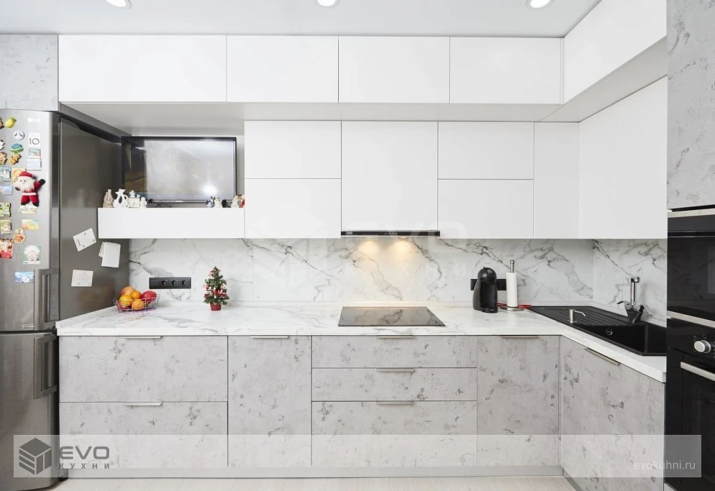 Лучше всего подходит классическая Г-образная планировка с шкафами до потолка. Светлые фасады и монохромный дизайн визуально увеличат помещение.