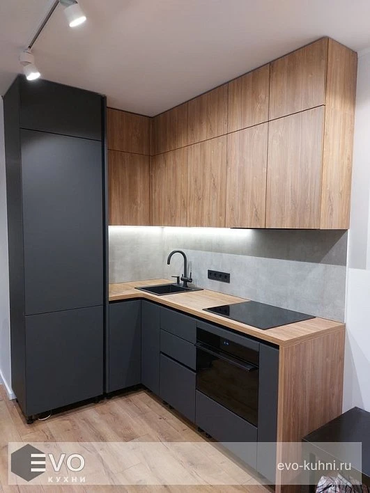 Если кухня маленькая, выбирать стоит светлые фасады и интегрированную технику. Маленькая кухня требует продуманных решений. Угловой гарнитур использует две стены, что освобождает место в центре для свободного перемещения.