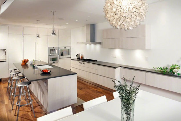 Ключевым элементом, привлекающим внимание, является роскошный кухонный стол, изготовленный из дерева. Его должны окружать большие и красивые стулья, которые добавят роскоши и объемности. Можно использовать барную стойку. Также необходимо применить остекление шкафов, которое сделает акцент на использование.