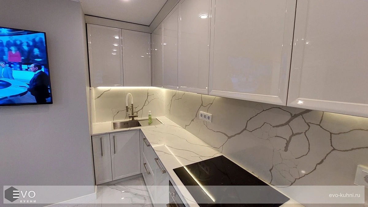 Столешницу можно сделать под камень, дерево или однотонную. Если фасады очень светлые, столешница в тёплом коричневом или древесном оттенках добавит уюта и практичности.
