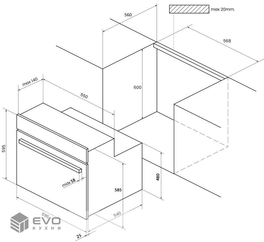 - Размер ниши для встраивания под столешницу (ВхШхГ), мм: 600×560×570