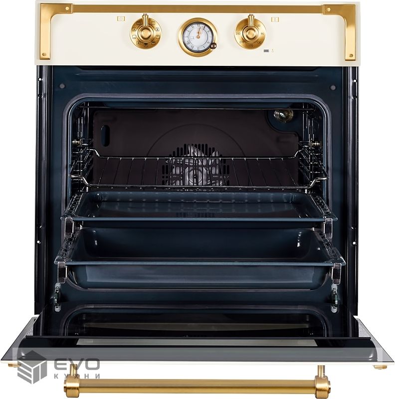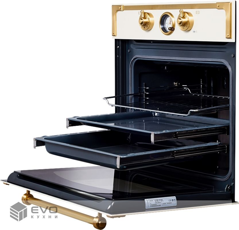Дизайнерский духовой шкаф Kuppersberg RC 699 C Bronze выполнен в элегантном винтажном стиле. Благородный бежевый цвет обрамлен фурнитурой бронзового оттенка. Эта модель напоминает дорогой антиквариат и помимо внешнего вида обладает богатым внутренним оснащением: 2 – ух уровневые телескопические направляющие позволяют использовать разный размер посуды для приготовления, эмаль Crystal Clean делает очистку духового шкафа легкой и простой.
