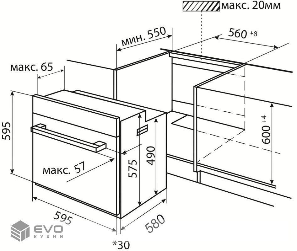 - Размер ниши для встраивания под столешницу (ВхШхГ), мм: 600×560×570