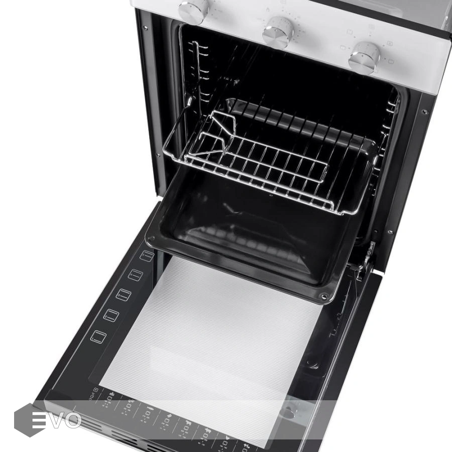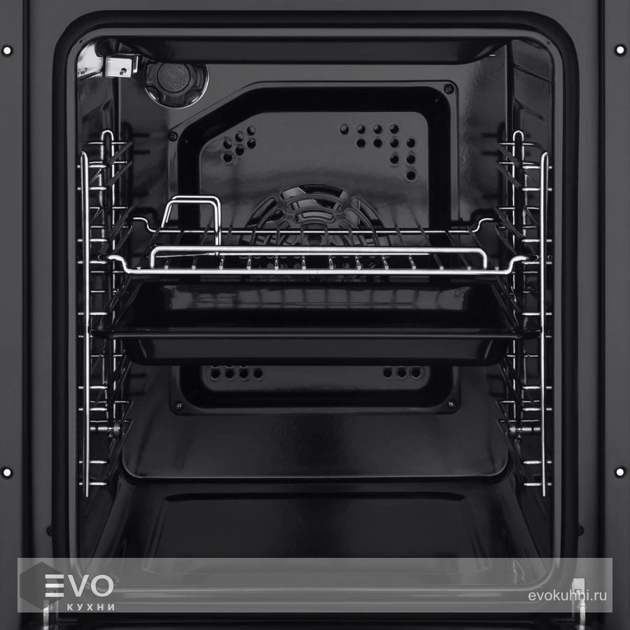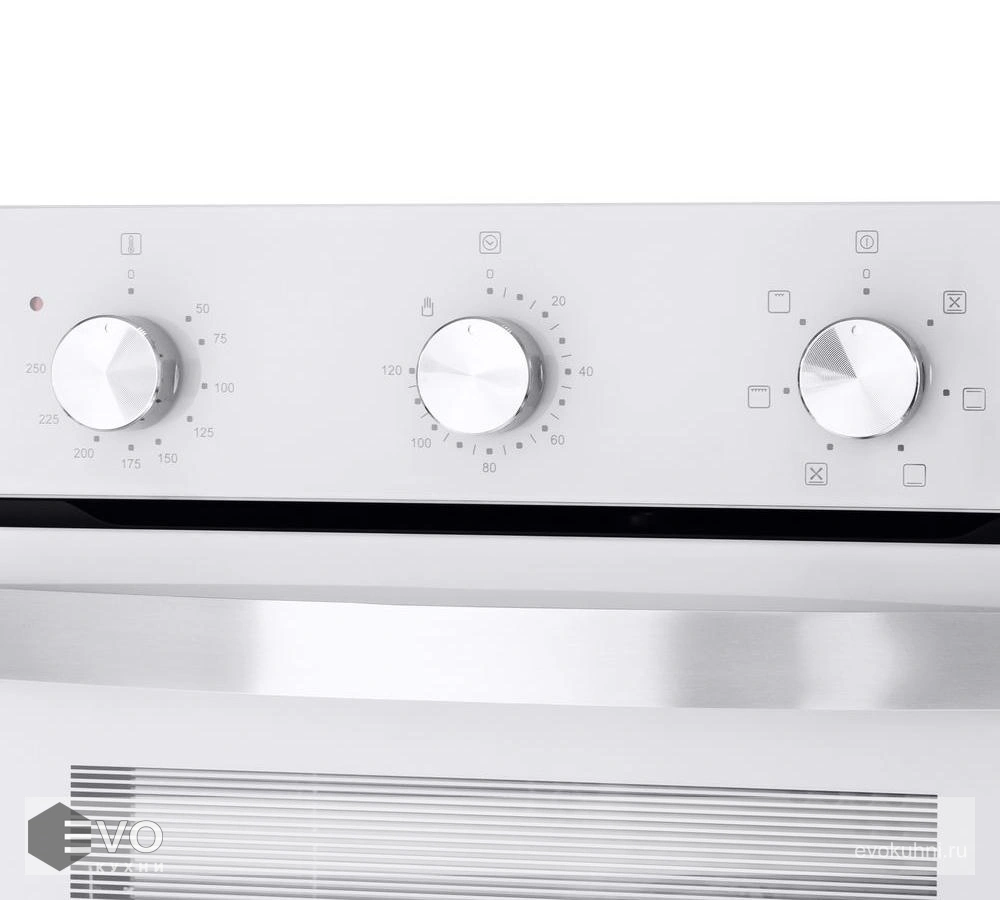 Механическое управление работой духовки осуществляется поворотными ручками. Можно установить таймер (до 120 мин), выбрать температуру (50°-250°C) и один из 7-ми режимов работы: внутреннее освещение, традиционный нагрев, большой гриль, конвекция с нижним нагревом, нижний нагрев, конвекционный нагрев, малый гриль.