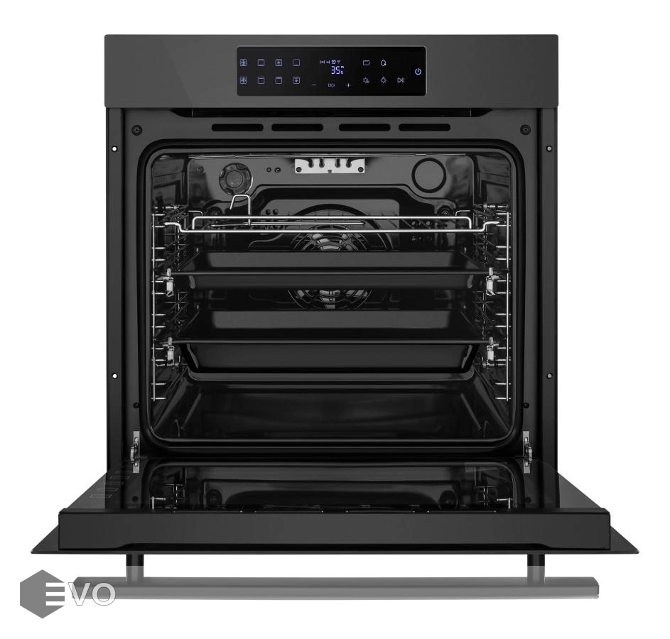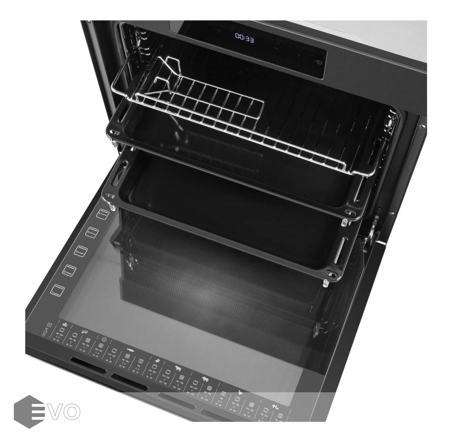 Два уровня оснащены удобными телескопическими направляющими. Внутреннее покрытие камеры выполнено из специальной легкоочищающейся эмали черного цвета. Фронтальная панель дверцы и лицевая часть блока управления сделаны из высококачественного жаропрочного стекла.