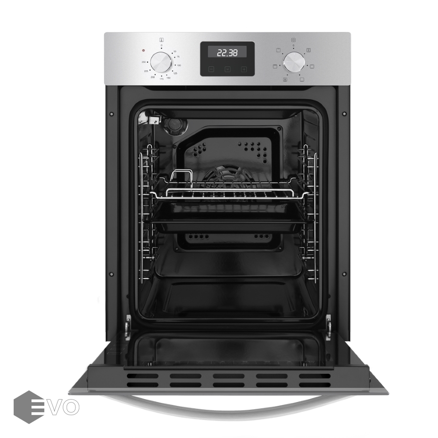 Фронтальная панель духовки сделана из высококачественного жаропрочного тонированного стекла черного цвета. Цельнометаллическая ручка дверцы остается холодной в процессе готовки. Комбинированное управление посредством сенсорного дисплея и цельнометаллических поворотных ручек позволяет установить таймер, выбрать температуру (50°-250°C) и один из 6-ти режимов работы.