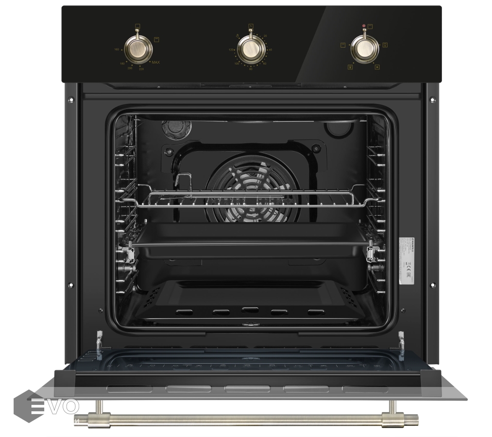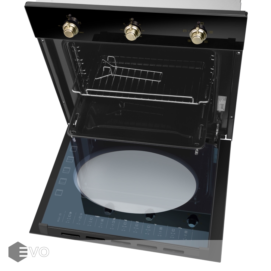 Шкаф духовой газовый MAUNFELD EOGC604RBG.MT – встраиваемый духовой шкаф объема 60 л при стандартной ширине 60 см позволяет готовить одновременно несколько блюд, разместив решетку или противень на одном из 5-ти уровней боковых направляющих. Один уровень оснащен удобными телескопическими направляющими. Внутреннее покрытие камеры выполнено из специальной легко очищающейся эмали. Пиктограммы на дверце духового шкафа в виде иконок или значков помогают хозяйке выбрать подходящий для случая режим работы устройства.