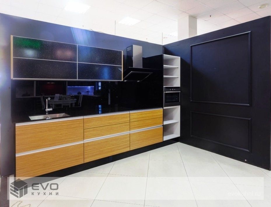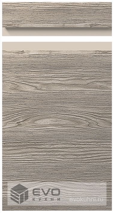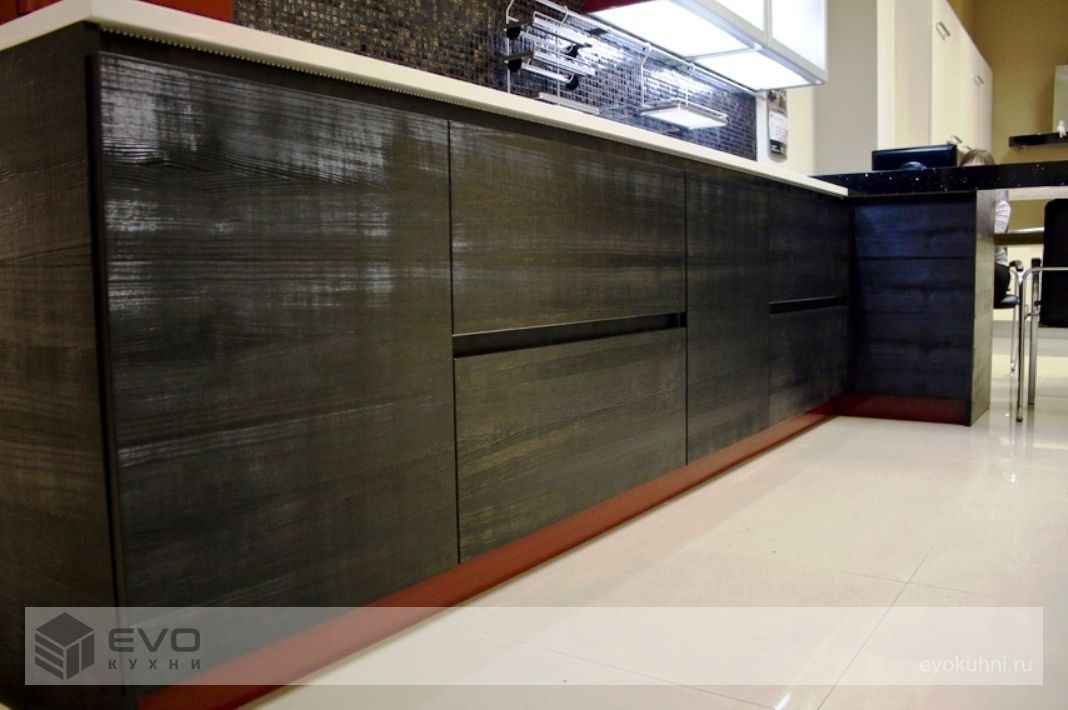 Модель с интегрированной ручкой. Плоскость фасада облицована шпоном, а ручка отделана эмалью, цвет которой оттеняет текстуру шпона или выступает ярким цветовым акцентом. Грамотно подобранное сочетание шпона и цвета эмали, а также глянцевой и матовой отделки придаст мебели дополнительную геометричность и завершенность.