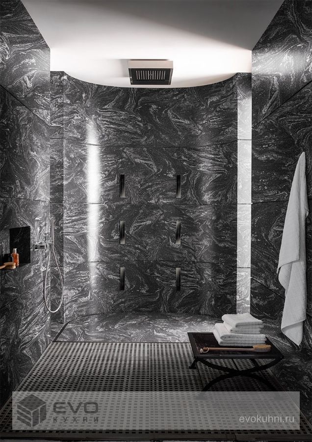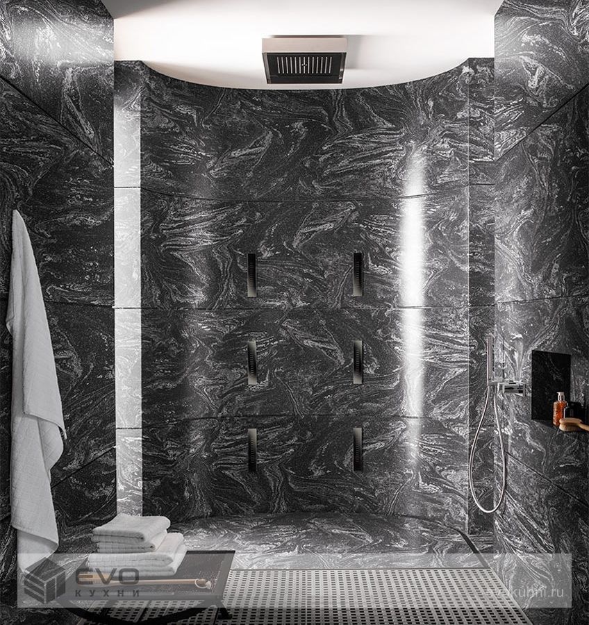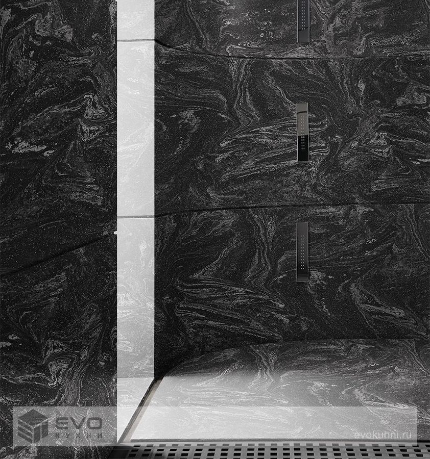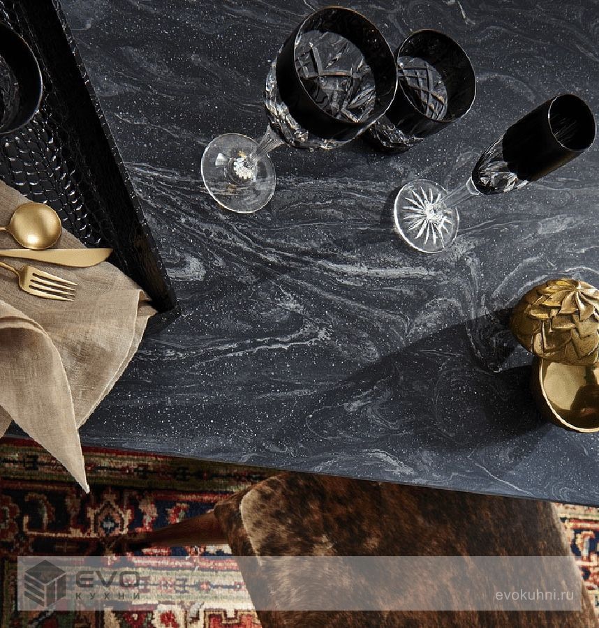 Этот смелый и бездонный, как вселенная, оттенок позволяет создать фоновую поверхность богатого черного цвета, на которой сверкают серо-белые полоски и прожилки. Новый образ будит в воображении тему космоса.