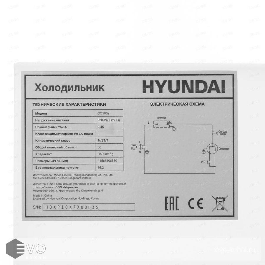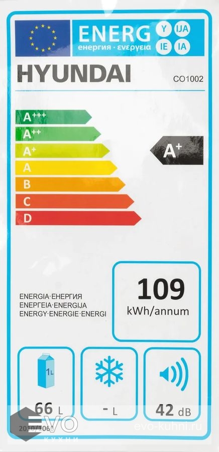 Модель относится к классу энергоэффективности A+. Это значит, что холодильник компактный Hyundai CO1002 экономно расходует электричество.
