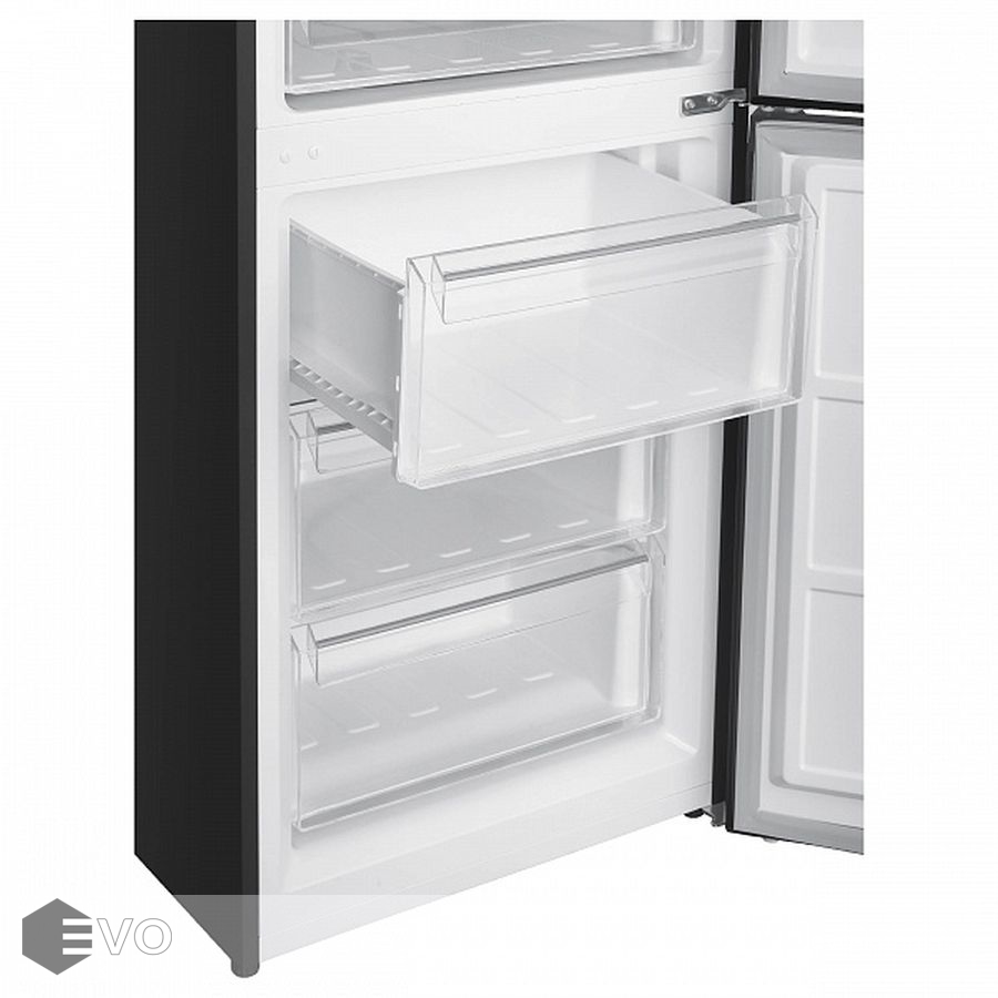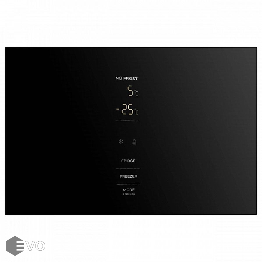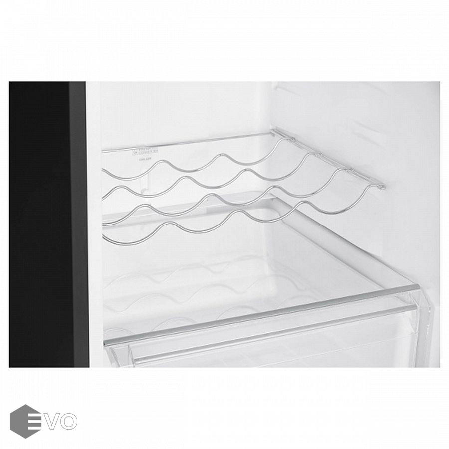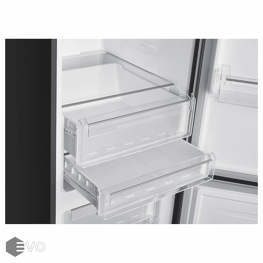 Отдельностоящий двухкамерный холодильник с нижней морозильной камерой. Оснащен сенсорным управлением. LED освещение камеры, скрытые ручки, металлическая полка для бутылок, ящик зоны свежести с 2 температурными режимами, ящик для овощей и фруктов, полки из закаленного стекла, емкость для льда.