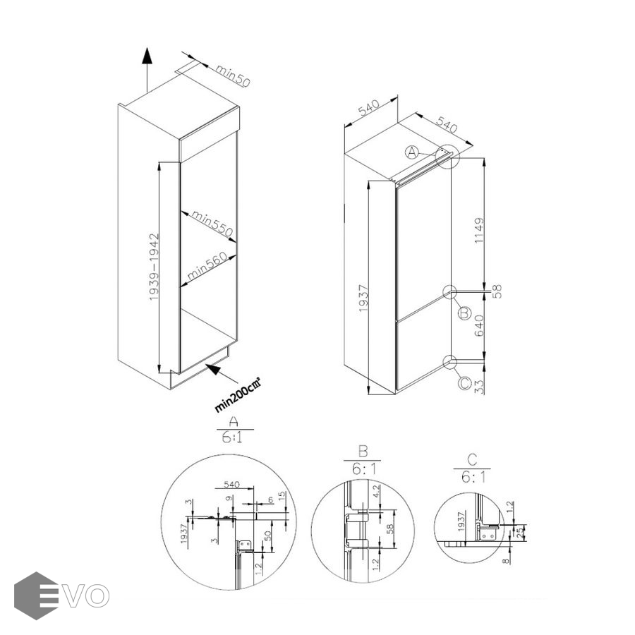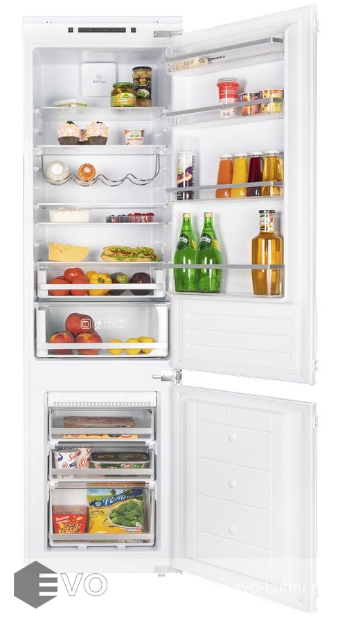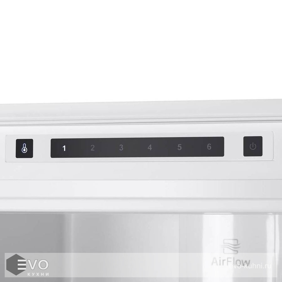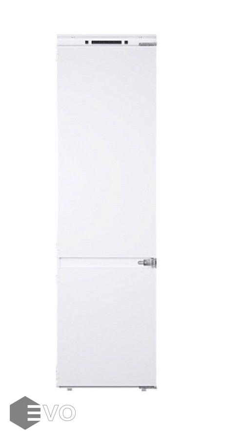Современный встраиваемый двухкамерный холодильник высотой 193 см. Корпус шириной 54 см сделан из металла.