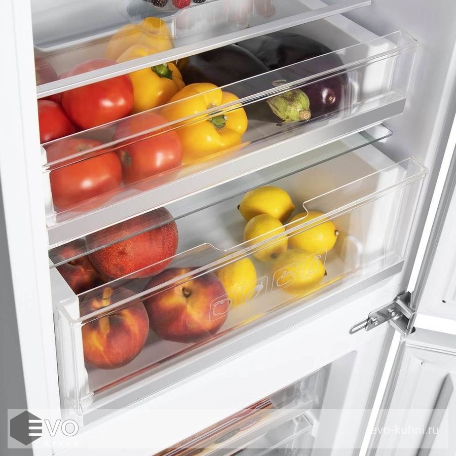 Предусмотрена возможность перенавешивания двери. В верхней холодильной камере (228 л), находятся: 5 стеклянных полок с металлической окантовкой, 2 выдвижных ящика для фруктов и овощей, 4 боковые полки на дверце. решетка для бутылок 2 лотка для яиц.