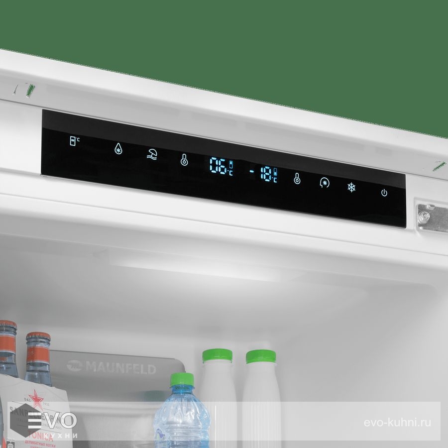 Встраиваемый холодильник MAUNFELD MBF19354NFWGR LUX имеет встроенную панель управления, оснащенная увеличенным дисплеем с индикацией температуры, и если она поднимется в любом из отделений, он подаст сигнал — как световой, так и акустический. То же самое произойдет, если вы забудете закрыть дверцу. Все это снижает вероятность порчи продуктов вследствие невнимательности или перебоев электроэнергии.