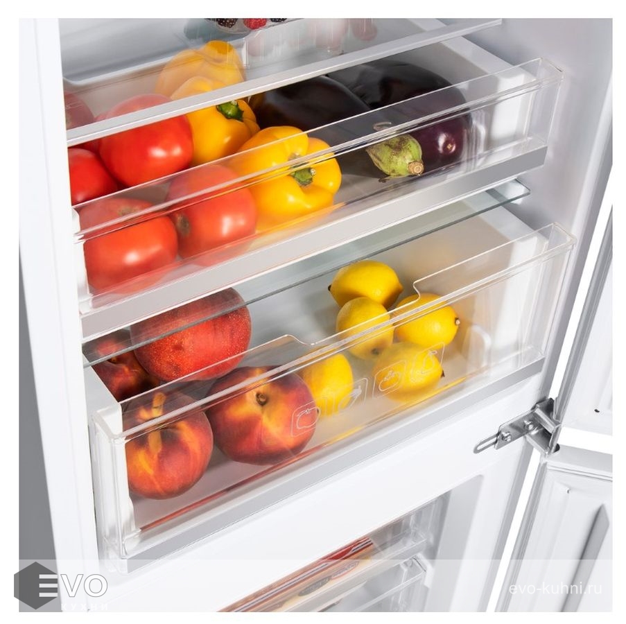 Два вместительных ящика для овощей и фруктов, один из которых оснащен слайдером для регулировки уровня влажности.