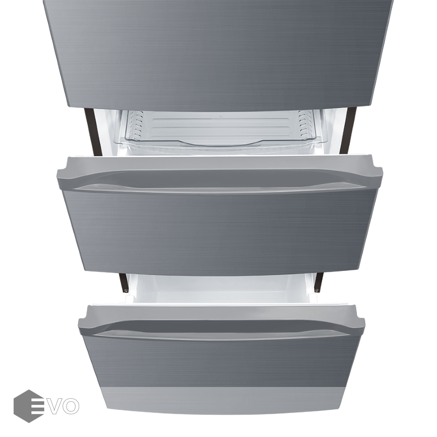 Трехдверный холодильник KNFF 61889 X цвета нержавеющей стали особенно понравится тем, кто ценит удобство хранения замороженных продуктов. Морозильное отделение включает в себя две камеры, каждое из которых имеет собственную дверцу. Также имеется специальный контейнер, в котором поддерживается оптимальное соотношение температуры и влажности для продления срока свежести фруктов, овощей и зелени.