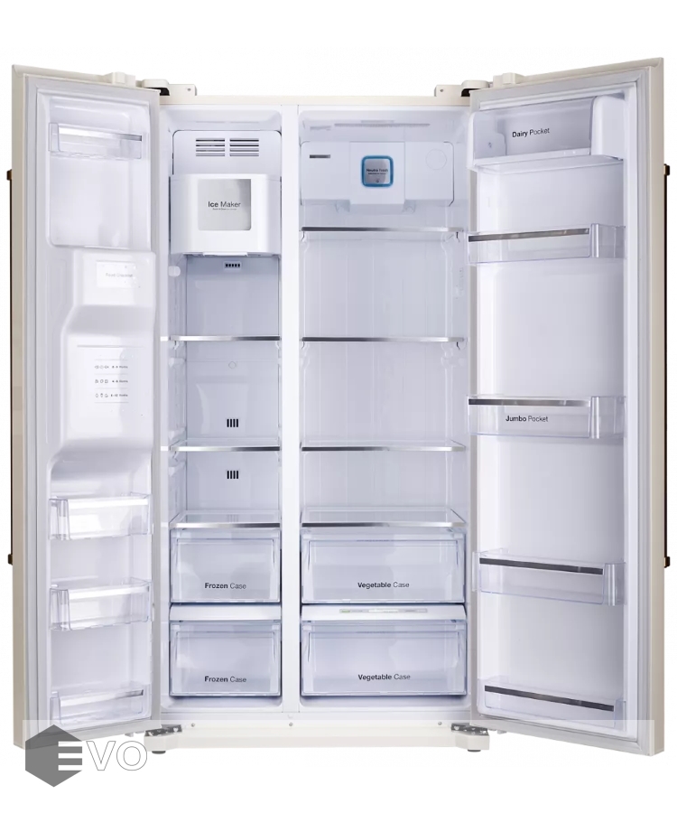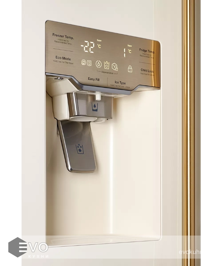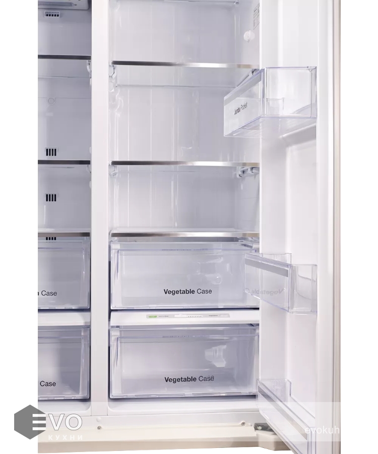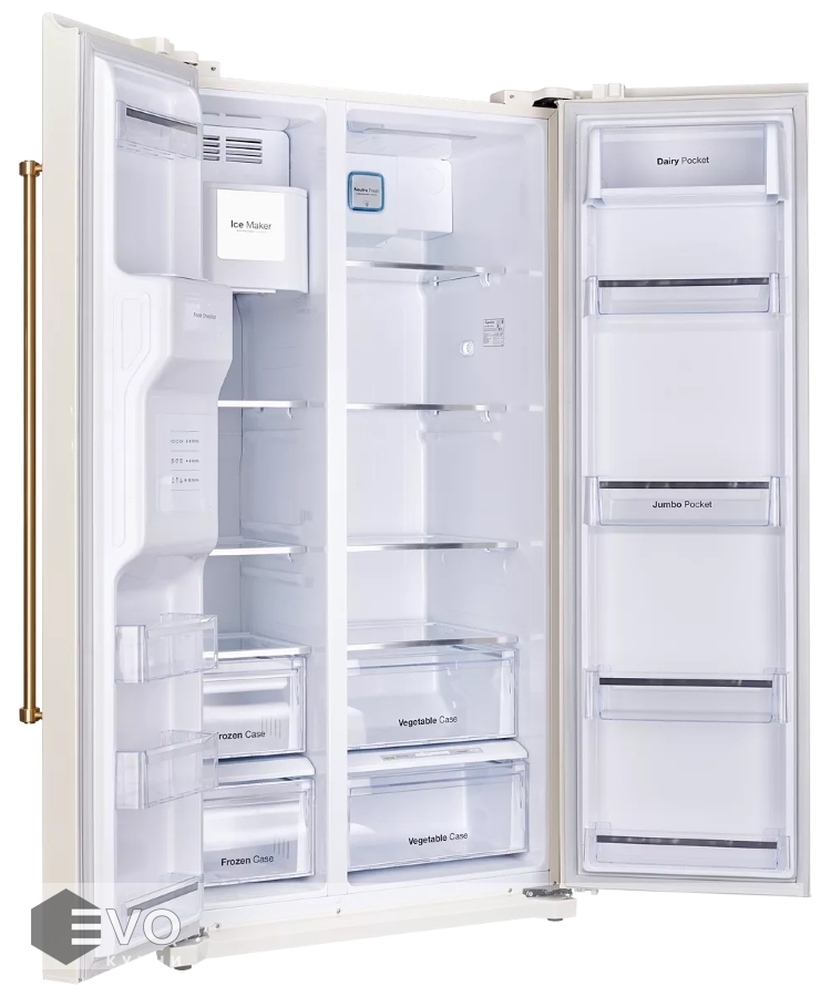 Холодильник Side by Side Kuppersberg NSFD 17793 C — модель бежевого цвета с системой охлаждения No Frost и ледогенератором. Зона свежести поможет сохранить овощи и фрукты дольше, в одном из ящиков можно держать охлажденное мясо или рыбу. В холодильном и морозильном отделении полки регулируются по высоте. Пониженная температура сохраняться до 12 часов при отключении электроэнергии.
