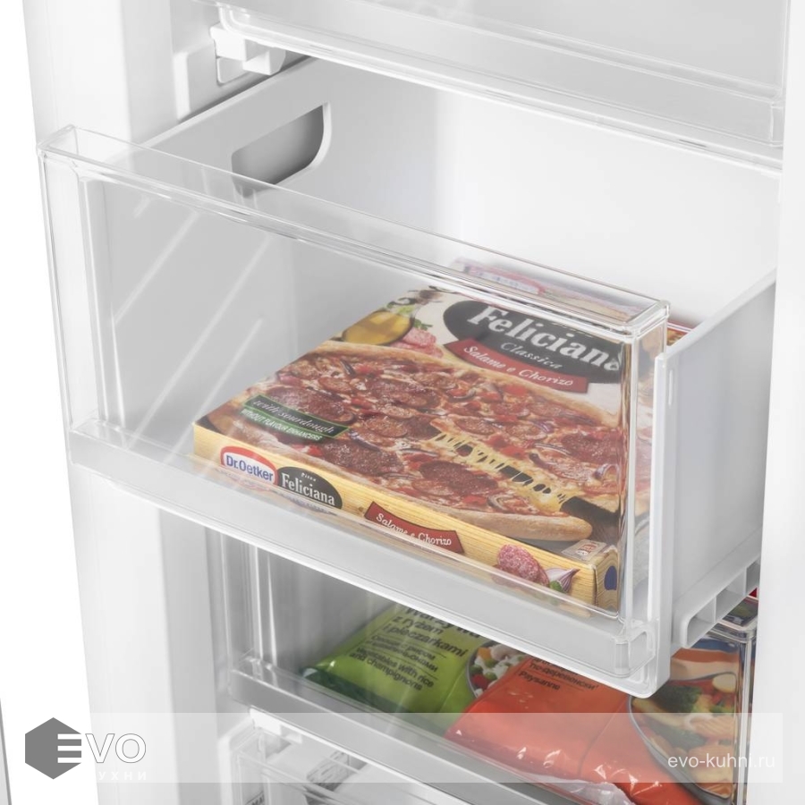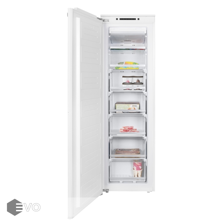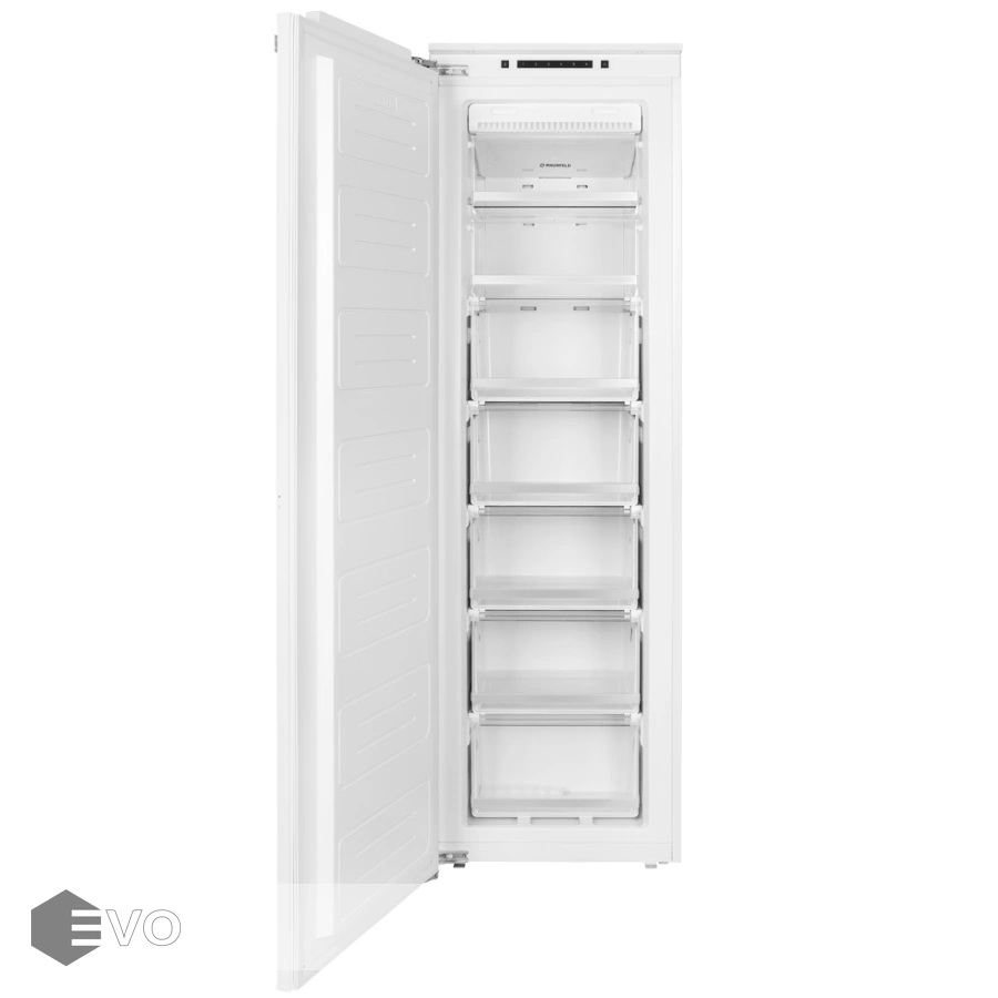 Морозильник встраиваемый MAUNFELD MBFR177NFW – встраиваемый морозильник высотой 177 см и объемом 203 л., корпус шириной 54 см сделан из металла. Внутренняя часть выполнена из антибактериального белого пластика легкой очистки. Внизу, для удобства загрузки, располагаются 5 выдвижных ящиков, в верней части - 2 полки с крышками. В комплекте есть емкость для льда.