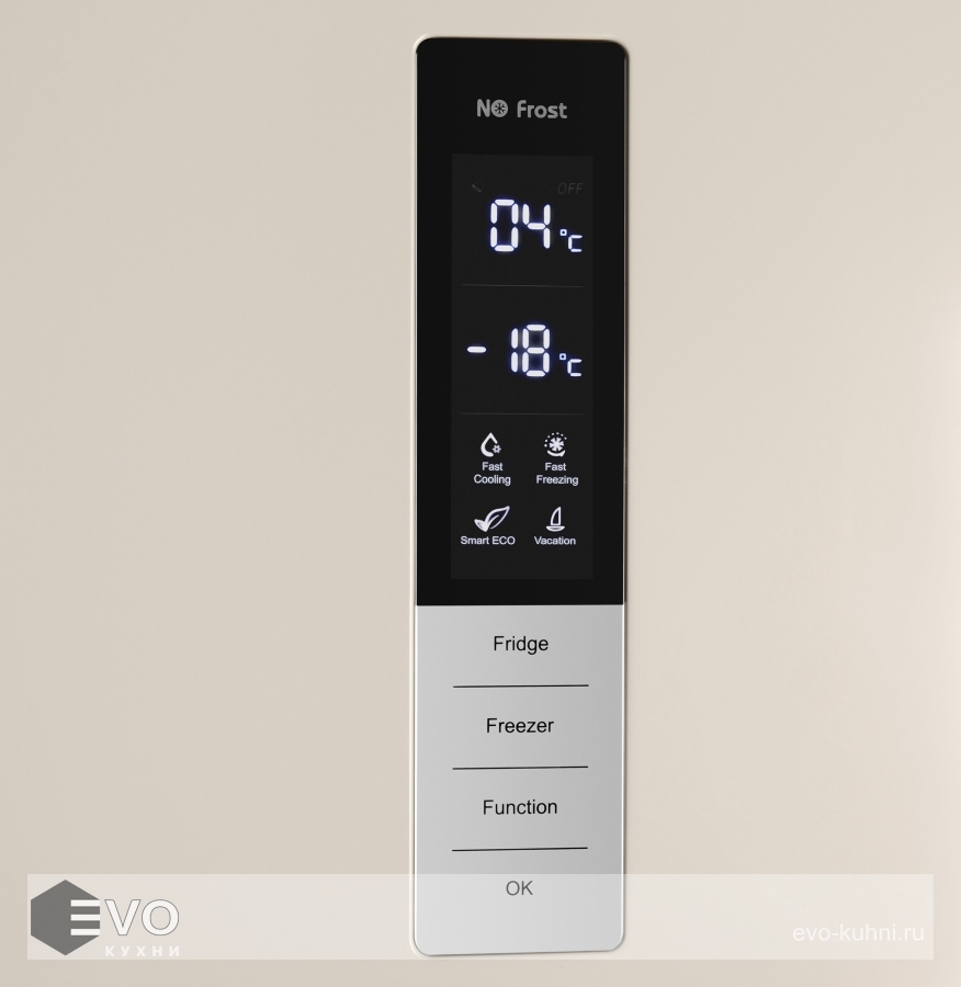 На сенсорном дисплее Вы можете выбрать: температуру холодильника (+2°C до +8°C), температуру морозилки (-16°C до -24°C), режим «Быстрая заморозка», режим «LECO», режим «Отпуск», режим «Смарт».