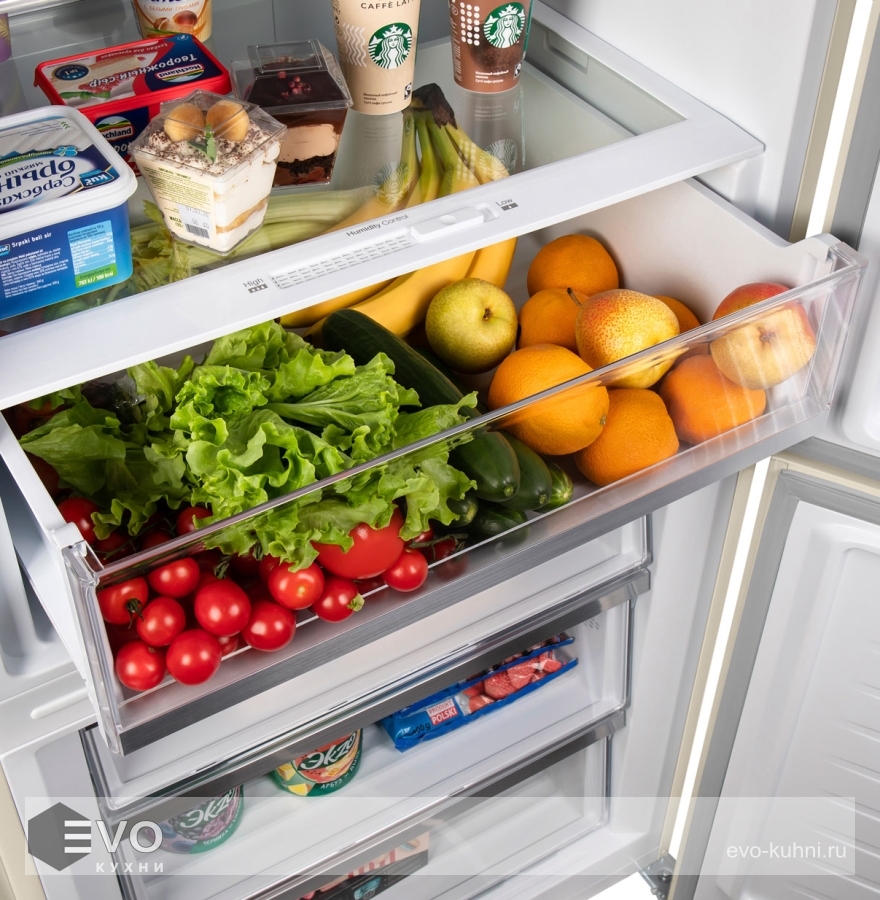 1. В холодильной камере находятся: 4 стеклянных полки с металлической окантовкой, одна корзина для фруктов и овощей, 4 боковые полки на дверце, решетка для бутылок, 2 лотка для яиц.