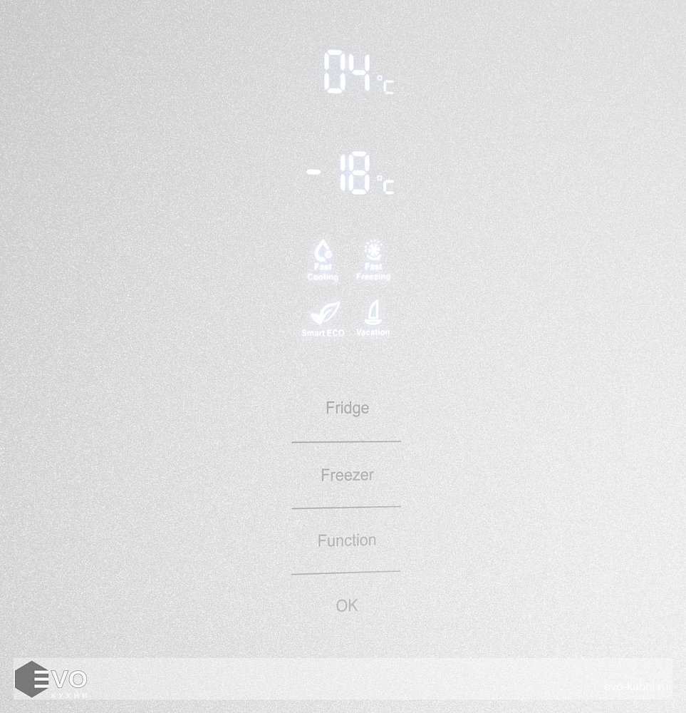Дисплей с сенсорным управлением находится на передней панели холодильника. Вы можете активировать: выбор температуры холодильника (+2°C до +8°C), выбор температуры морозилки (-16°C до -24°C), функцию «Быстрая заморозка», функцию «Быстрая охлаждение», функцию «Отпуск», функцию «Смарт».
