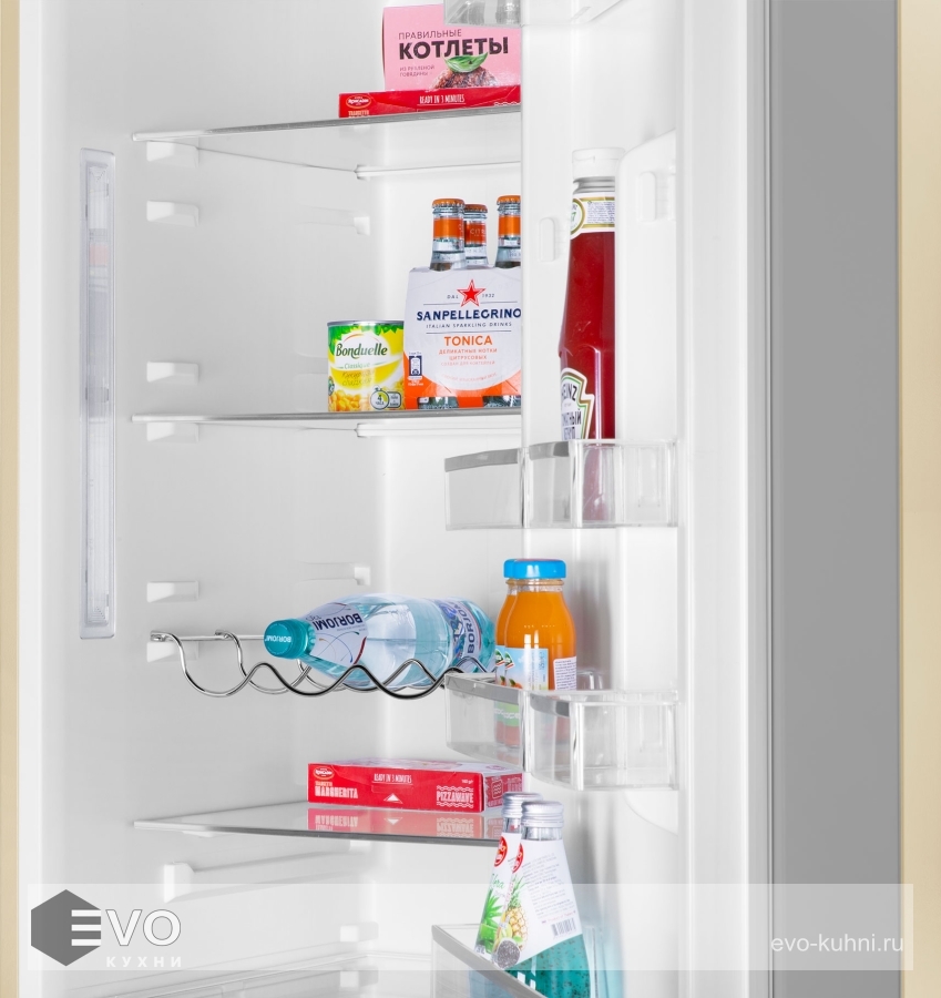 1. В верхней холодильной камере находятся: 4 стеклянные полки с металлической окантовкой, одна большая корзина для фруктов и овощей, 4 боковые полки на дверце, решетка для бутылок, 2 лотка для яиц