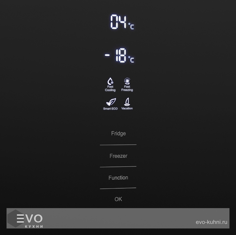 Предусмотрена возможность перенавешивания двери. Температурный режим настраивается индивидуально в каждой камере. На сенсорном дисплее Вы можете выбрать: температуру холодильника (+2°C до +8°C), температуру морозилки (-16°C до -24°C), режим «Быстрая заморозка», режим «Отпуск», режим «Смарт».