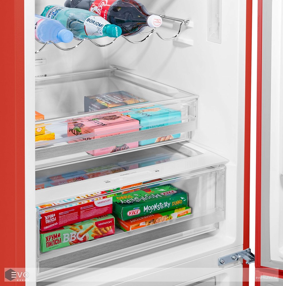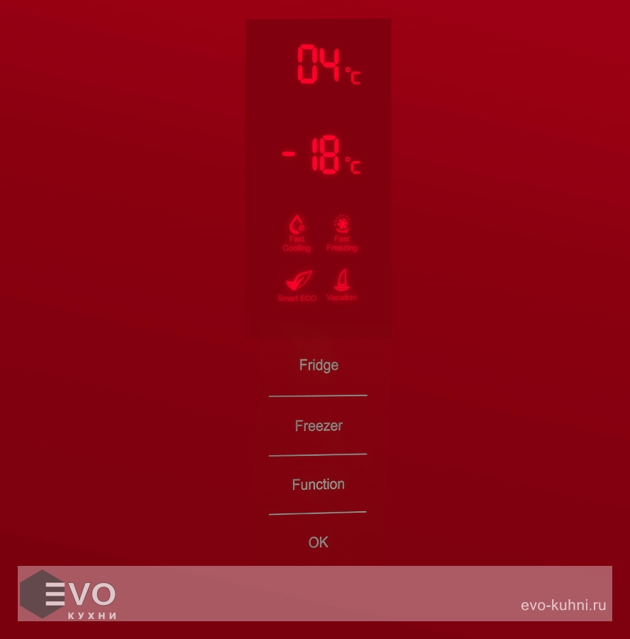 Предусмотрена возможность перенавешивания двери. Температурный режим настраивается индивидуально в каждой камере. На сенсорном дисплее Вы можете выбрать: температуру холодильника (+2°C до +8°C), температуру морозилки (-16°C до -24°C), режим «Быстрая заморозка», режим «Отпуск», режим «Смарт».
