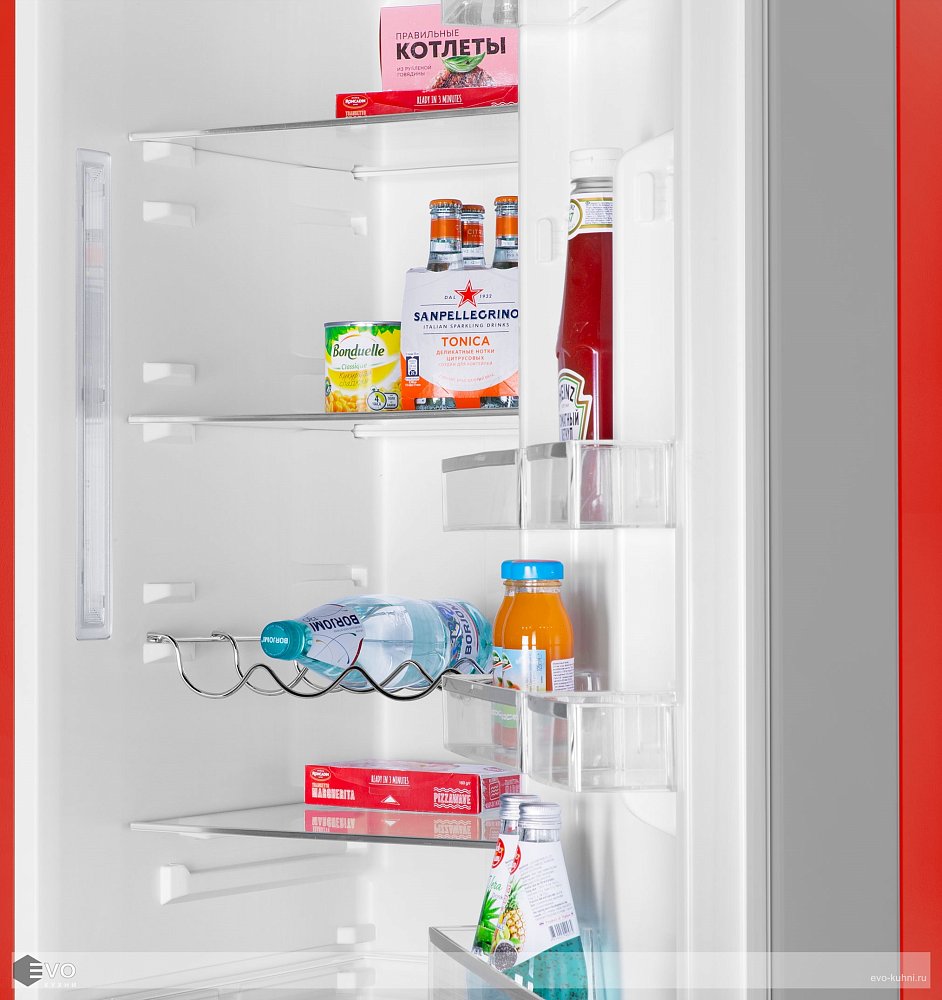 1. В верхней холодильной камере находятся: 4 стеклянные полки с металлической окантовкой, одна большая корзина для фруктов и овощей, одна малая корзина для фруктов и овощей, 6 боковых полок на дверце, решетка для бутылок, 2 лотка для яиц.