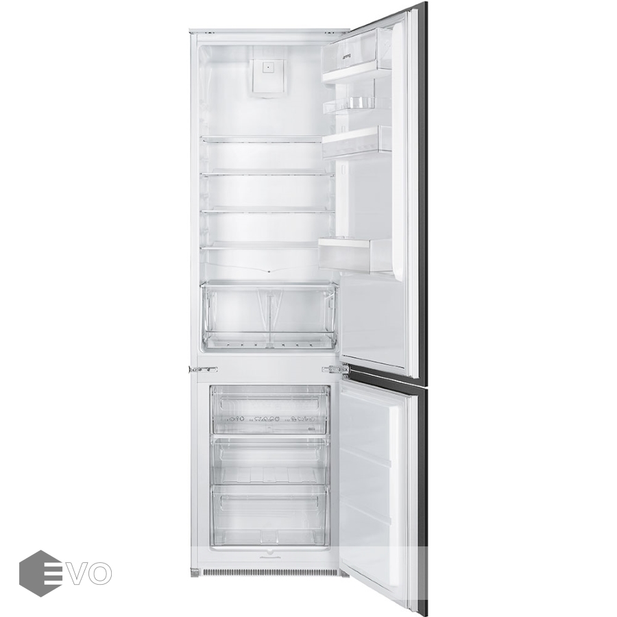 Холодильник встраиваемый Smeg C3192F2P – двухкамерный холодильник с электромеханической системой управления встраивается в нишу, фасады крепятся с помощью скользящих направляющих, дверь можно перенавешивать. Для холодильной камеры предусмотрена автоматическая система размораживания, исключающая образование наледи на стенках, а для морозильника — ручная система размораживания.