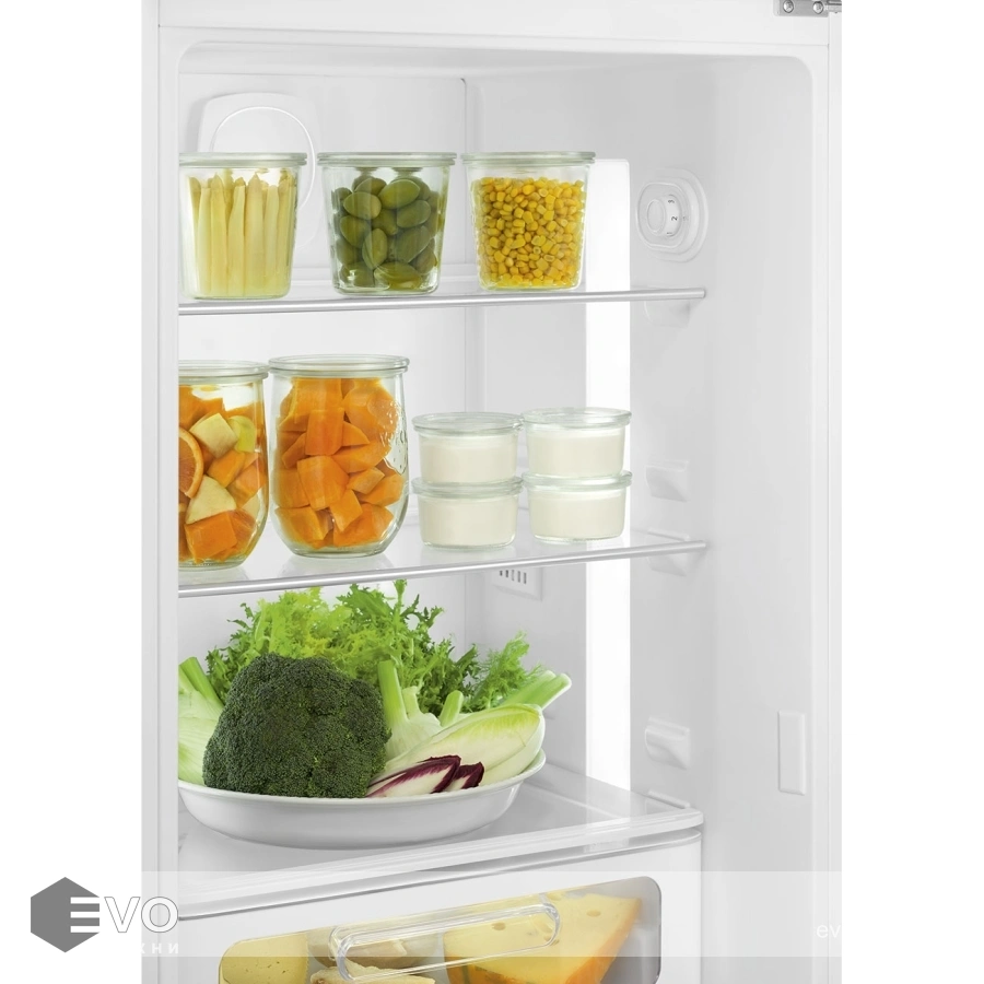 В холодильном отделении предусмотрен бокс с поддержанием влажности для хранения фруктов/овощей/зелени, полки из прочного стекла с регулируемой высотой. На двери встроены полки для хранения высоких стеклянных бутылок и мелких предметов. Морозильный отсек разделен полкой для удобного раздельного хранения продуктов.