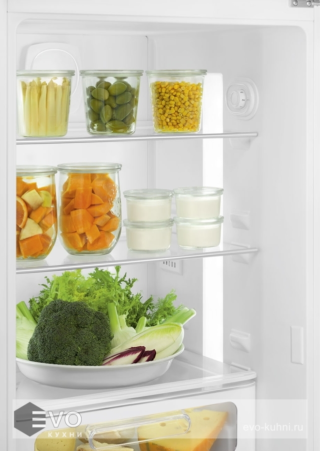 В холодильном отделении предусмотрен бокс с поддержанием влажности для хранения фруктов/овощей/зелени, полки из прочного стекла с регулируемой высотой. На двери встроены полки для хранения высоких стеклянных бутылок и мелких предметов. Морозильный отсек разделен полкой для удобного раздельного хранения продуктов.