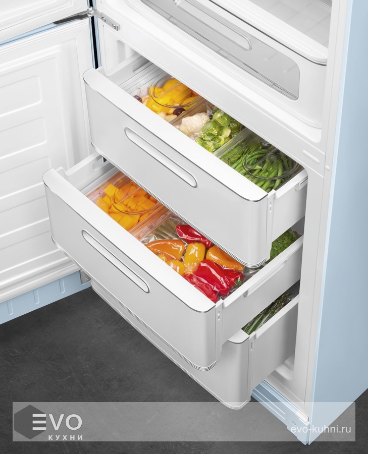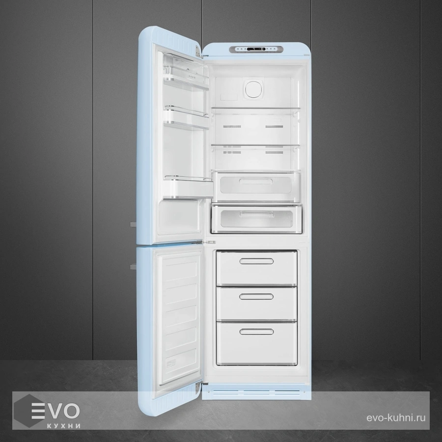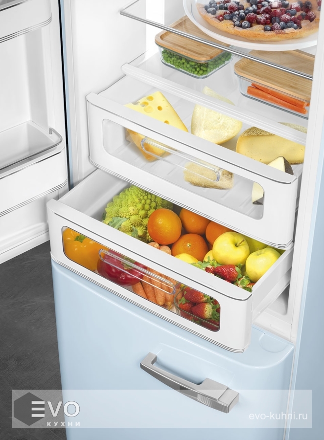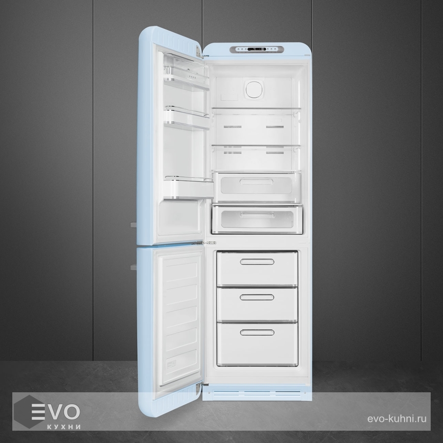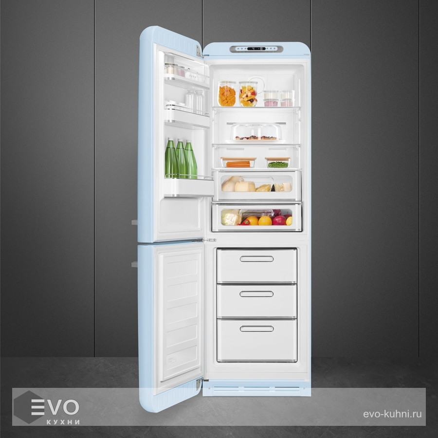 Холодильник Smeg FAB32LPB5 – отдельностоящий, двухдверный холодильник, стиль 50-х годов, характеризуется экономным потреблением электроэнергии, при достаточном объеме, который удовлетворит потребности хранения. Округлые формы и хромированные детали идеально сочетают внутренние и внешние двери холодильника. Профили ящиков на дверях и стеклянных полок имеют яркие хромированные элементы с ретро-дизайном.