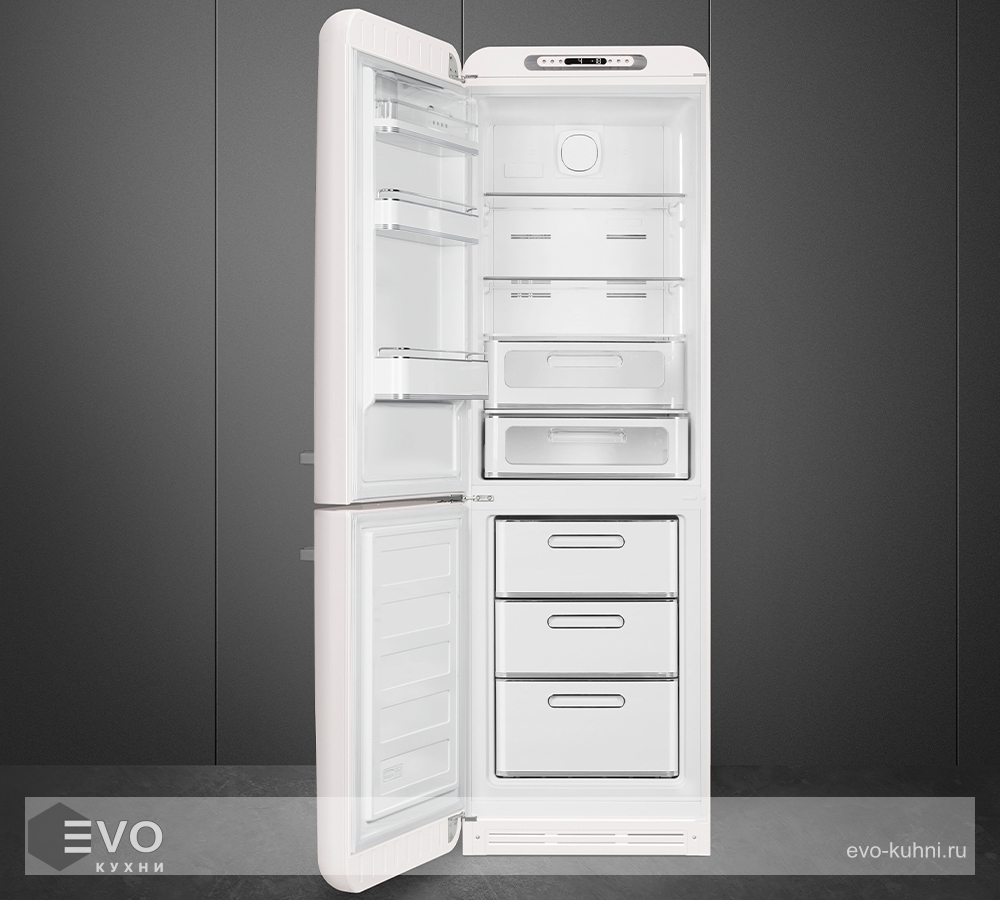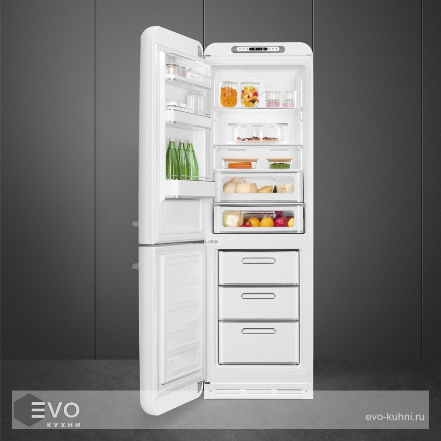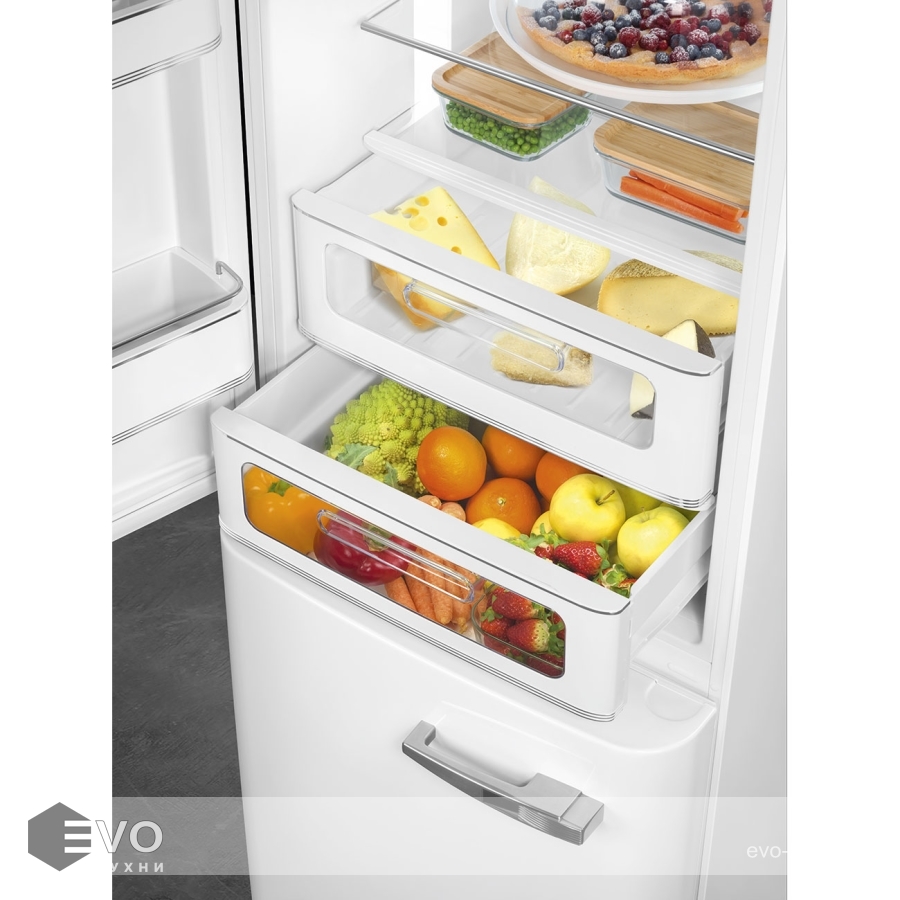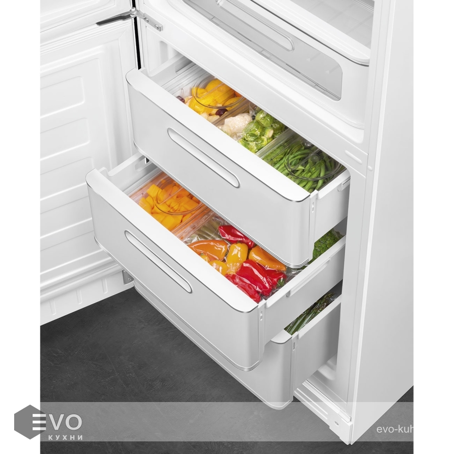 Холодильник Smeg FAB32LWH5 – отдельностоящий, двухдверный холодильник, стиль 50-х годов, характеризуется экономным потреблением электроэнергии, при достаточном объеме, который удовлетворит потребности хранения. Округлые формы и хромированные детали идеально сочетают внутренние и внешние двери холодильника. Профили ящиков на дверях и стеклянных полок имеют яркие хромированные элементы с ретро-дизайном.