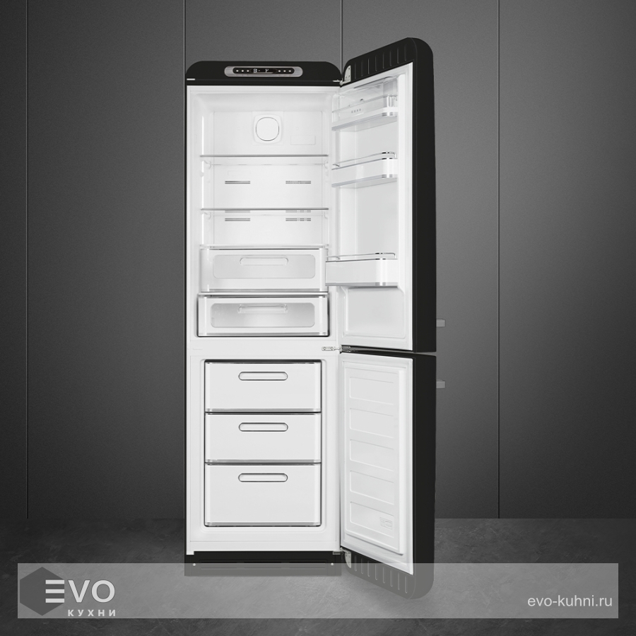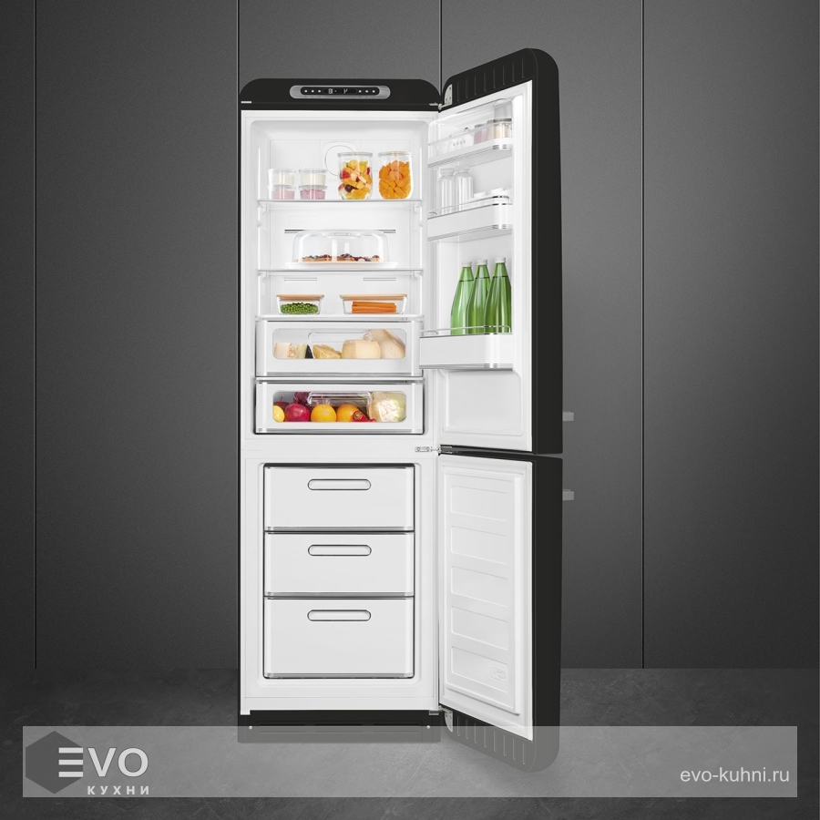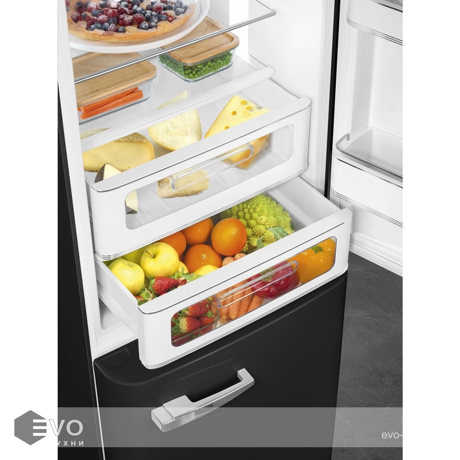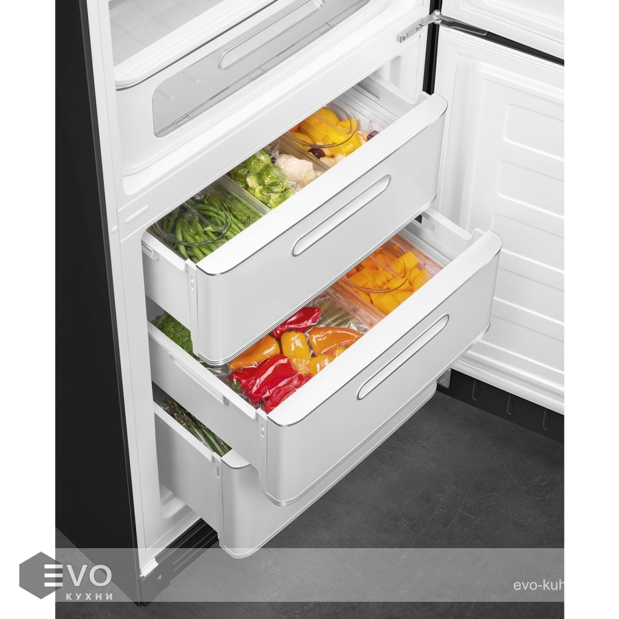Холодильник Smeg FAB32RBL5 – отдельностоящий, двухдверный холодильник, стиль 50-х годов, характеризуется экономным потреблением электроэнергии, при достаточном объеме, который удовлетворит потребности хранения. Округлые формы и хромированные детали идеально сочетают внутренние и внешние двери холодильника. Профили ящиков на дверях и стеклянных полок имеют яркие хромированные элементы с ретро-дизайном.