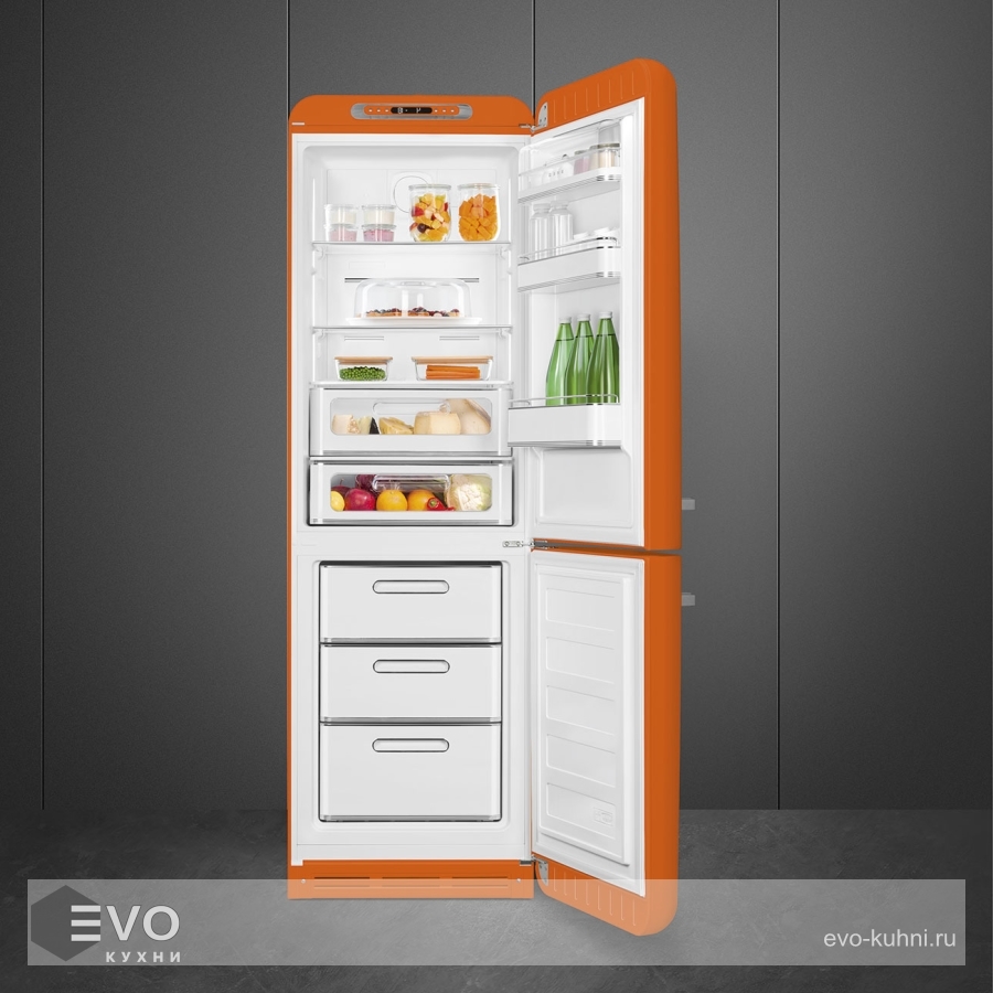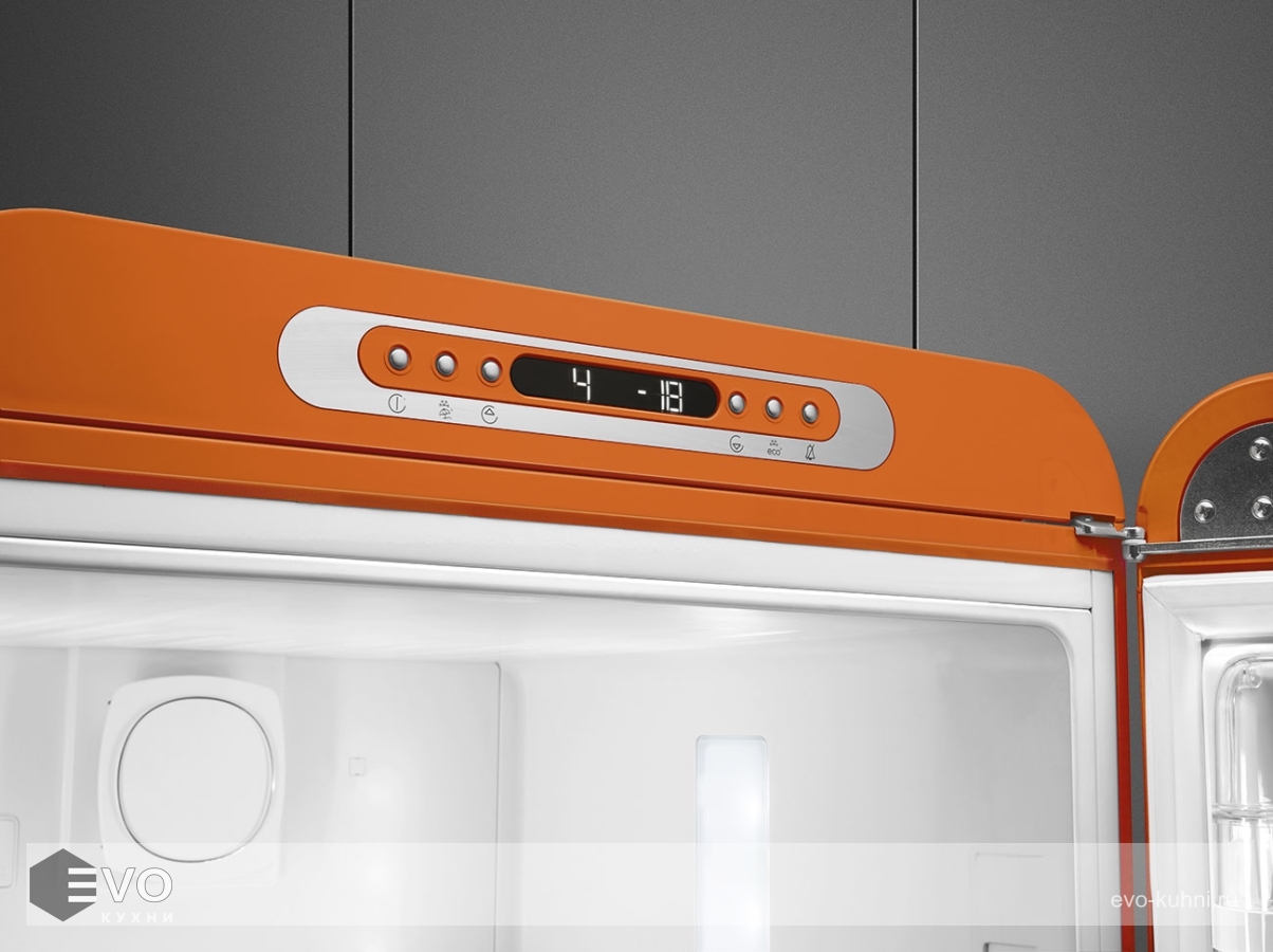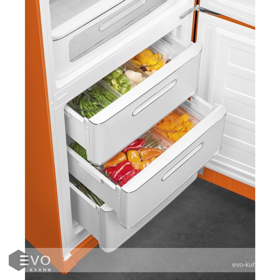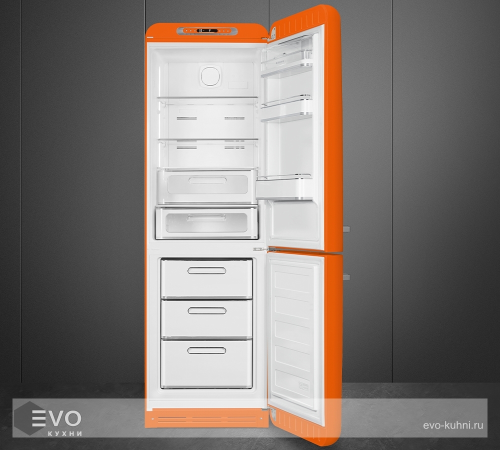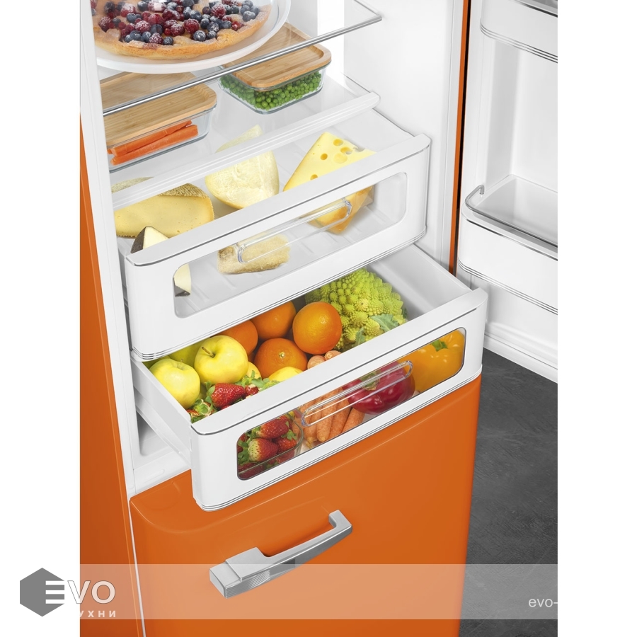 Холодильник Smeg FAB32ROR5 – отдельностоящий, двухдверный холодильник, стиль 50-х годов, характеризуется экономным потреблением электроэнергии, при достаточном объеме, который удовлетворит потребности хранения. Округлые формы и хромированные детали идеально сочетают внутренние и внешние двери холодильника. Профили ящиков на дверях и стеклянных полок имеют яркие хромированные элементы с ретро-дизайном.