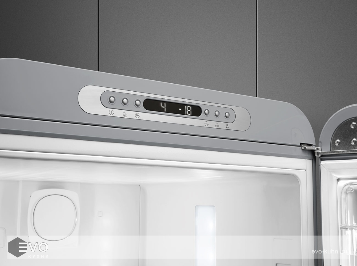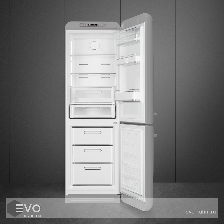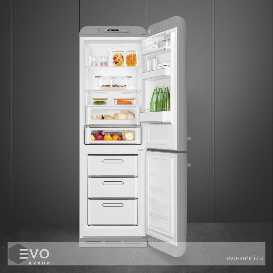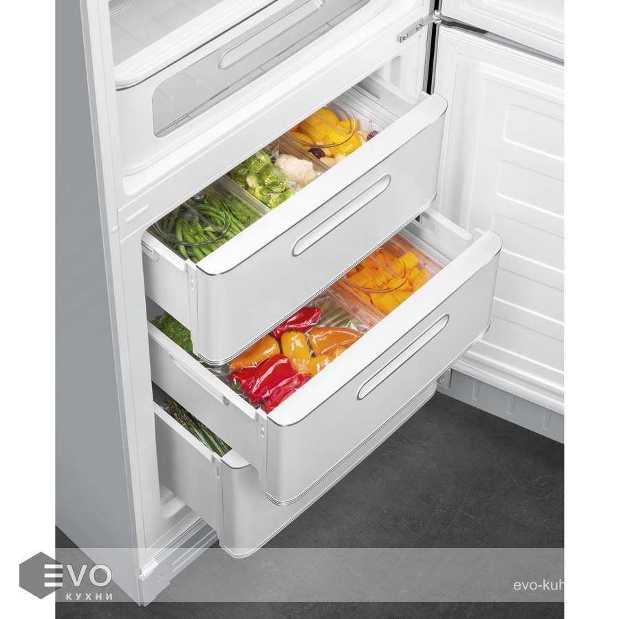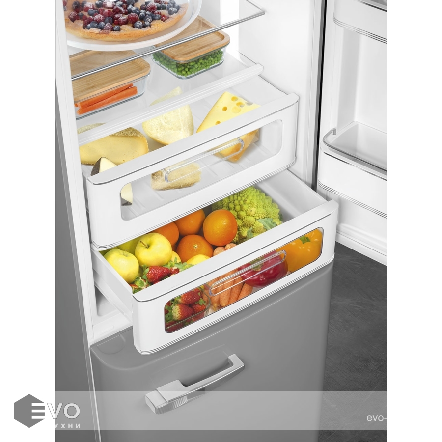 Холодильник Smeg FAB32RSV5 – отдельностоящий, двухдверный холодильник, стиль 50-х годов, характеризуется экономным потреблением электроэнергии, при достаточном объеме, который удовлетворит потребности хранения. Округлые формы и хромированные детали идеально сочетают внутренние и внешние двери холодильника. Профили ящиков на дверях и стеклянных полок имеют яркие хромированные элементы с ретро-дизайном.