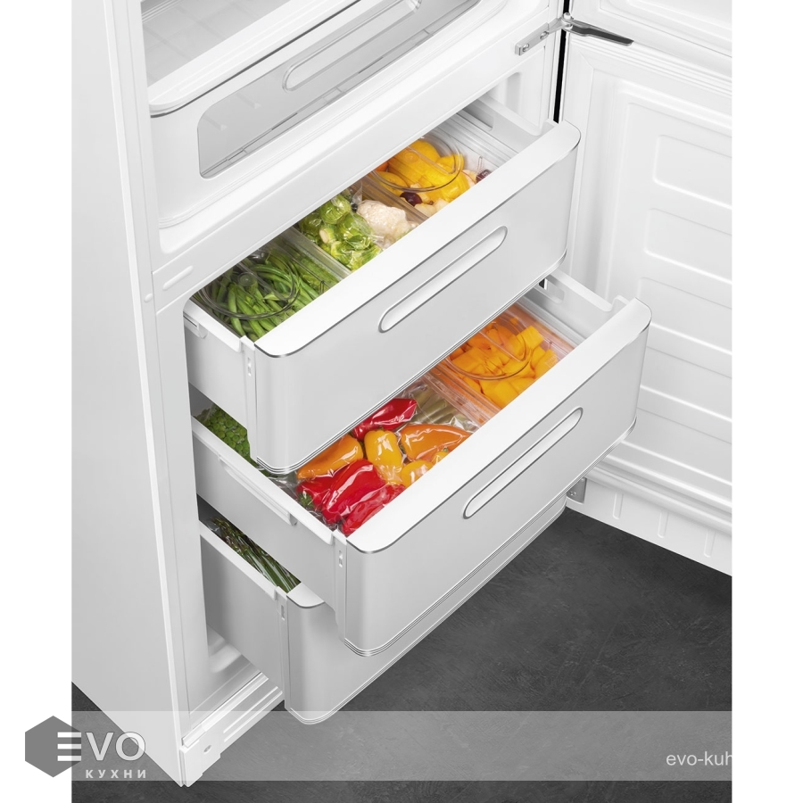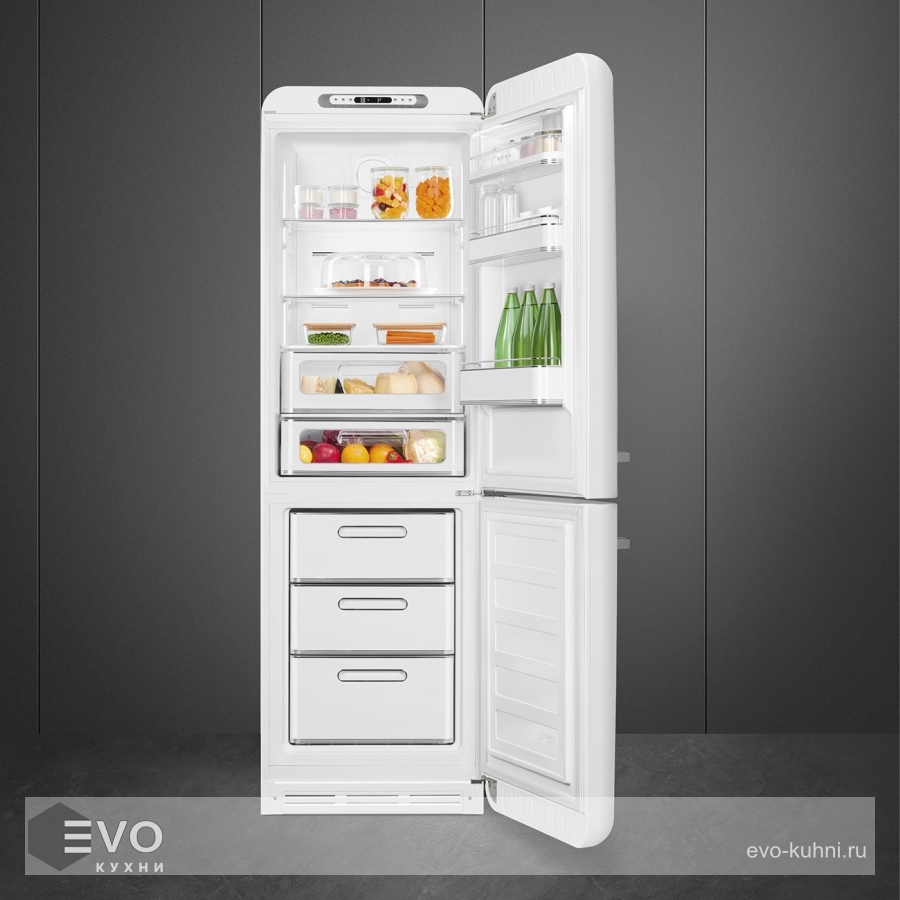 Холодильник Smeg FAB32RWH5 – отдельностоящий, двухдверный холодильник, стиль 50-х годов, характеризуется экономным потреблением электроэнергии, при достаточном объеме, который удовлетворит потребности хранения. Округлые формы и хромированные детали идеально сочетают внутренние и внешние двери холодильника. Профили ящиков на дверях и стеклянных полок имеют яркие хромированные элементы с ретро-дизайном.