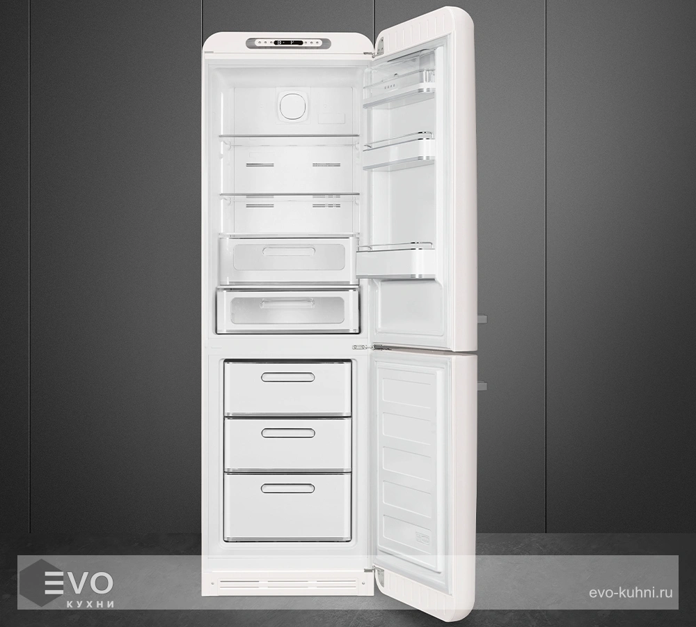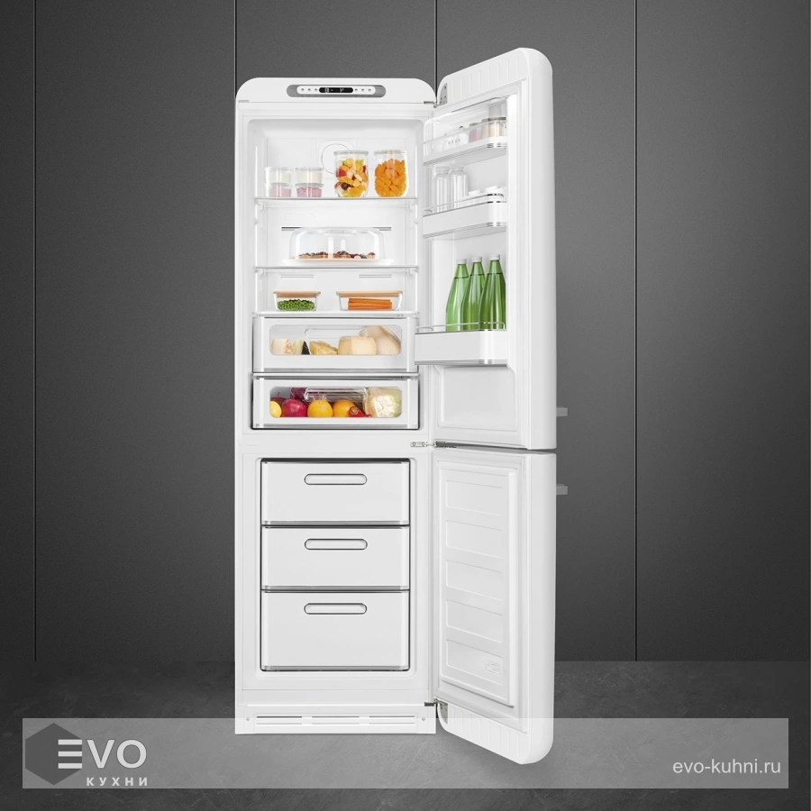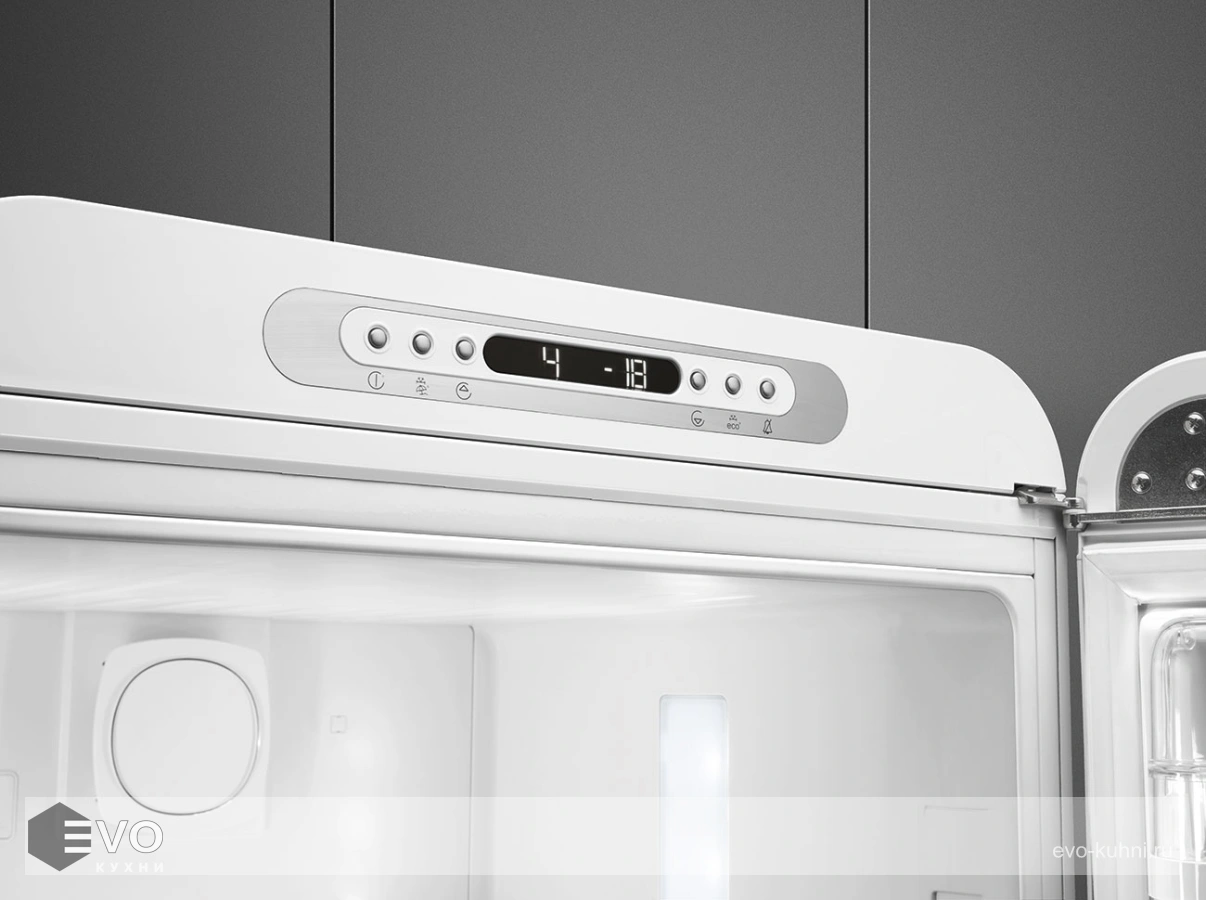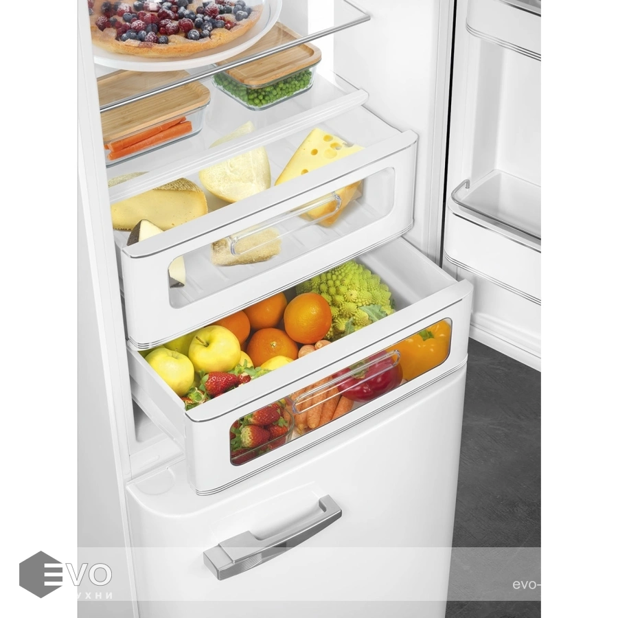 Холодильник Smeg FAB32RWH5 – отдельностоящий, двухдверный холодильник, стиль 50-х годов, характеризуется экономным потреблением электроэнергии, при достаточном объеме, который удовлетворит потребности хранения. Округлые формы и хромированные детали идеально сочетают внутренние и внешние двери холодильника. Профили ящиков на дверях и стеклянных полок имеют яркие хромированные элементы с ретро-дизайном.