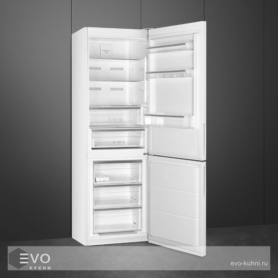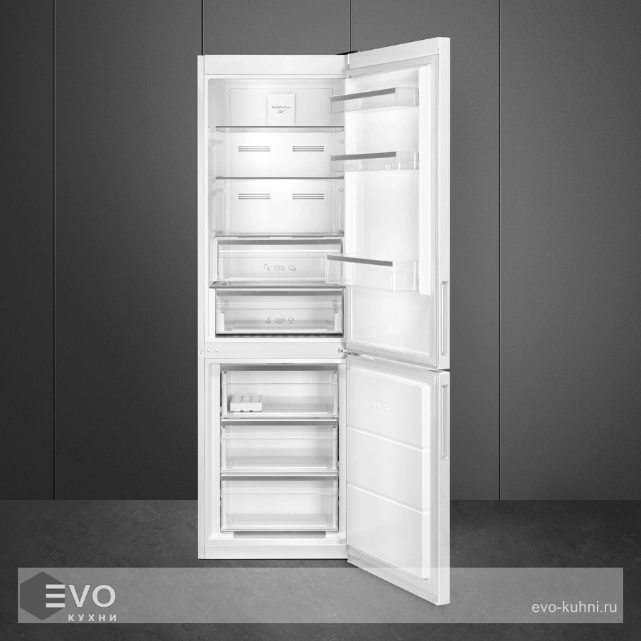 Холодильник Smeg FC20EN1W – двухкамерный холодильник изготовлен в классическом белом цвете, модель можно установить отдельно или встроить в гарнитур. Дверь открывается вровень со стеной, а также обладает возможностью перевешивания. Система автоматического охлаждения No-Frost освобождает ваше личное время. Больше не придется заниматься самостоятельным размораживанием холодильника. Внутреннее LED — освещение устойчиво к перепадам низких температур. В комплекте предусмотрены несколько формочек для льда, а также есть отделение для бутылок и яиц.