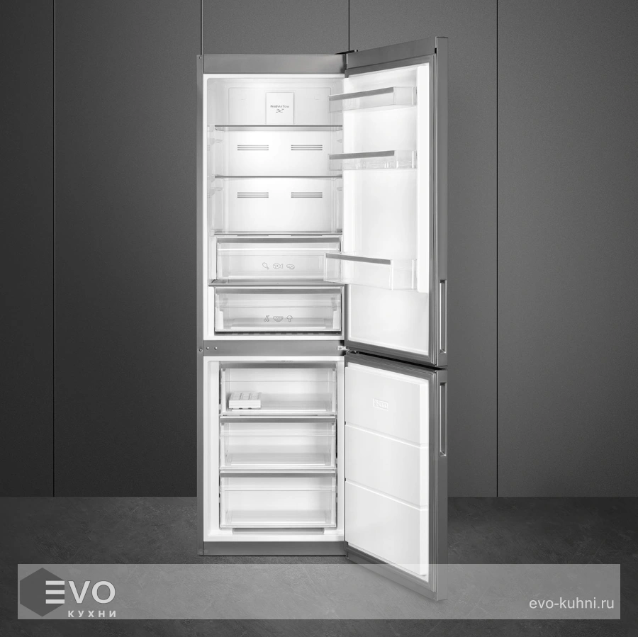 Холодильник Smeg FC20EN1X – двухкамерный холодильник изготовлен в цвете нержавеющей стали, модель можно установить отдельно или встроить в гарнитур. Дверь открывается вровень со стеной, а также обладает возможностью перевешивания. Система автоматического охлаждения No-Frost освобождает ваше личное время. Больше не придется заниматься самостоятельным размораживанием холодильника. Внутреннее LED — освещение устойчиво к перепадам низких температур. В комплекте предусмотрены несколько формочек для льда, а также есть отделение для бутылок и яиц.