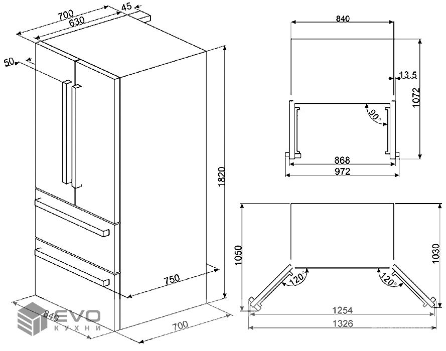 Для полного выдвижения внутренних ящиков необходимо открытие дверей холодильника минимум на 120 градусов (левая и правая дверцы – 261 мм)