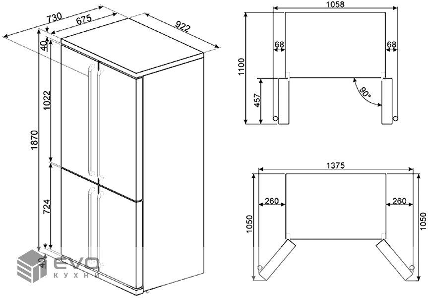 Для полного выдвижения внутренних ящиков необходимо открытие дверей холодильника минимум на 120 градусов (левая и правая дверцы – 261 мм)