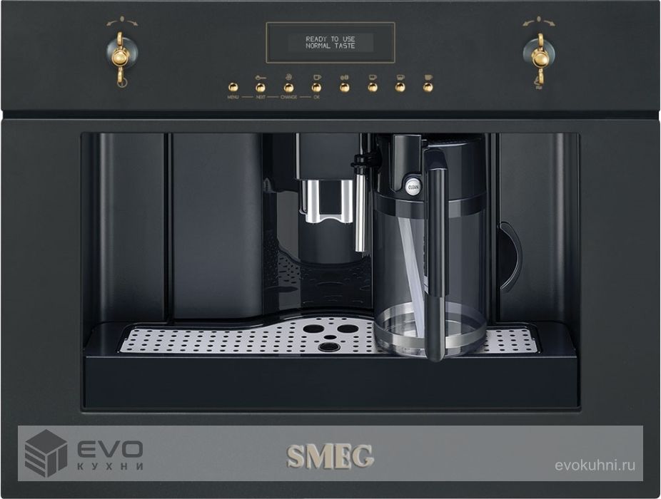Автоматическая кофемашина Smeg CMS8451A – встраиваемая в колонну автоматическая кофемашина с латунной фурнитурой предназначается для работы с молотым и зерновым кофе. Модель отличает горизонтальная панель управления с цветным многоязычным LСD-дисплеем и поворотными переключателями в стиле ретро. Пользователь может приготовить себе напиток в соответствии со своими предпочтениями: выбрать один из трех уровней регулировки количества кофе на чашку и задать уровень крепости напитка от очень слабого до крепкого и очень крепкого.