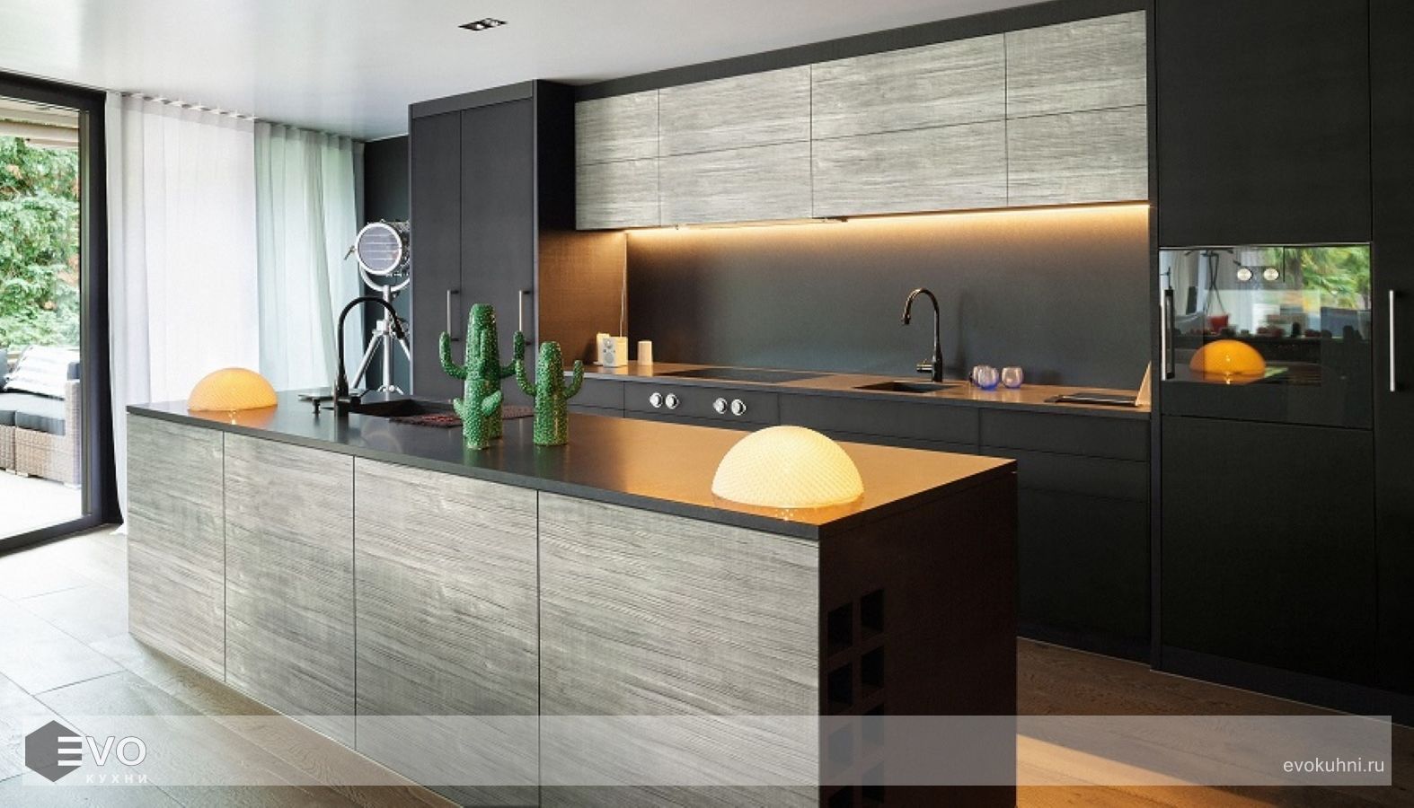Прямая кухня хай-тек с островом с рельефными фасадами Split Pearl –– имитация трещины на старой доске, пролежавшей под дождем и высушенной солнцем.