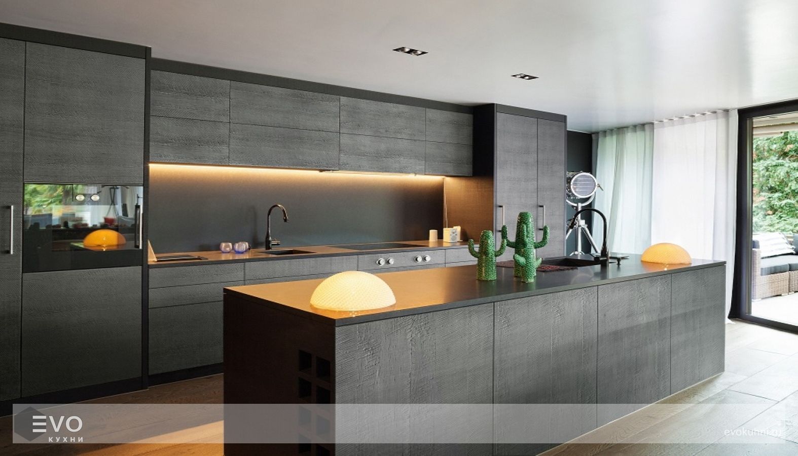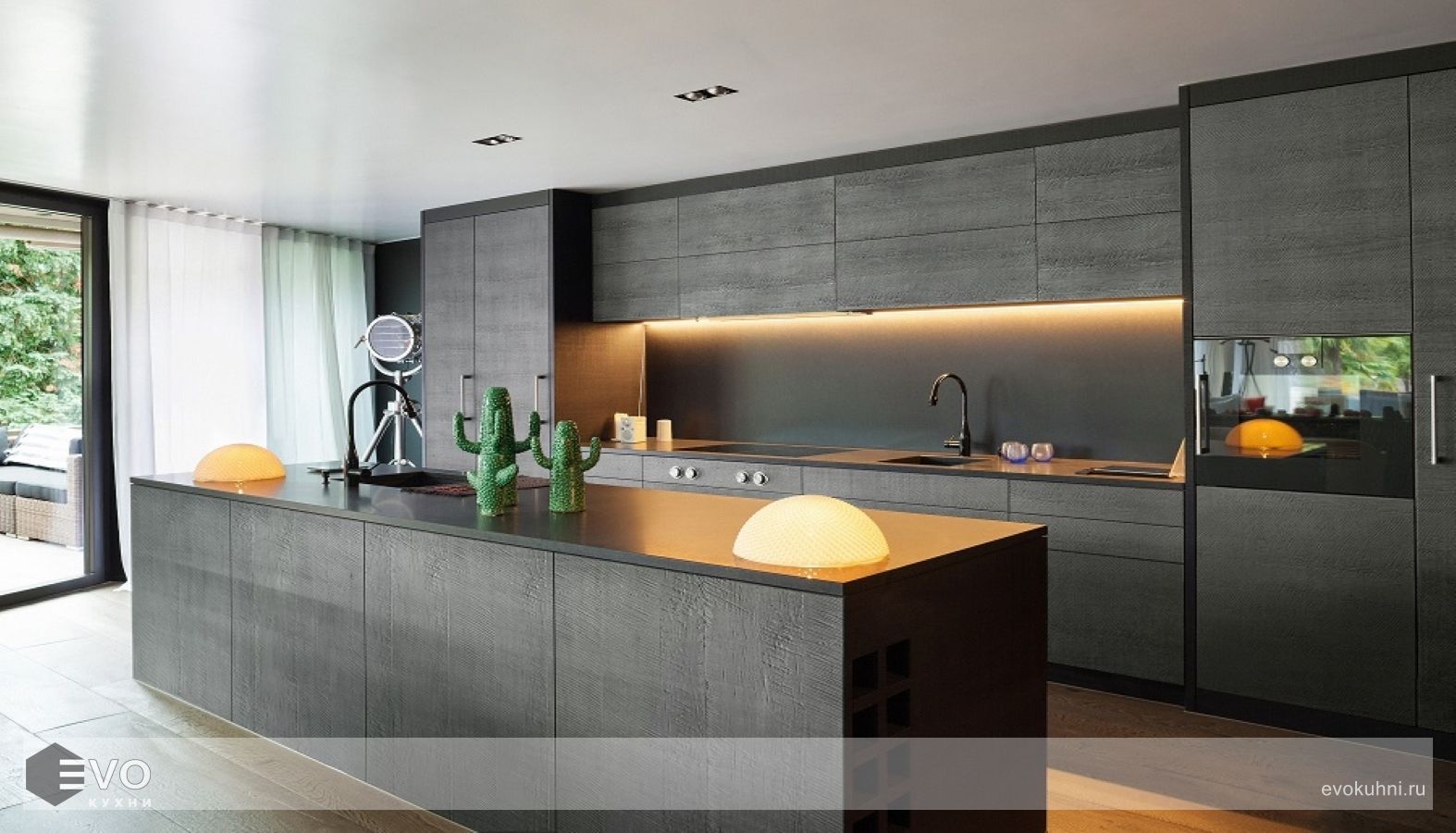 Прямая кухня хай-тек с островом с рельефными фасадами Серая Линия – эффект пиления поперек волокна древесины.