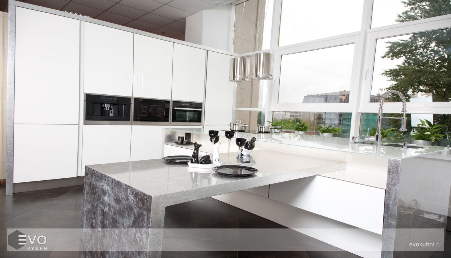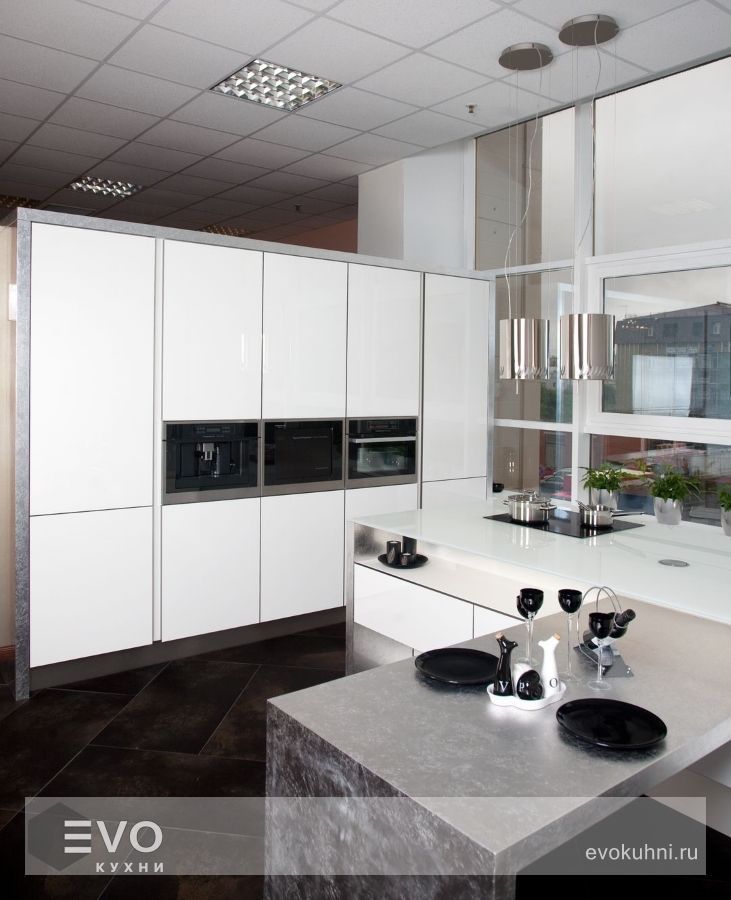 Прямая кухня хай-тек с островом с трендовыми фасадами Luxus Silver - сочетание черного с серебристым, в серебристой потали особенно элегантно смотрится тонкая рамка. И кончено, высокий глянец при правильной подсветке придает всей кухне особый шик.