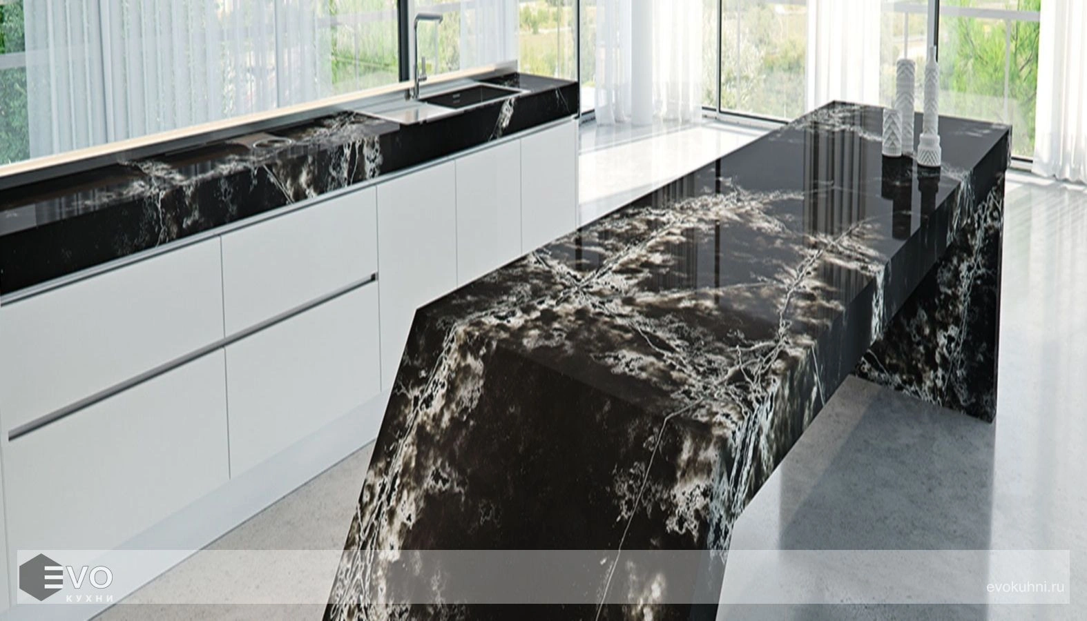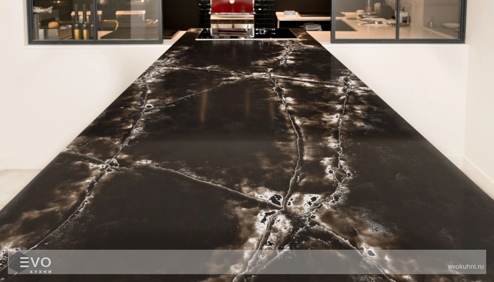 - Столешница для кухни из кварца будет очень удобна в использовании, потому что ее невозможно поцарапать ножом.