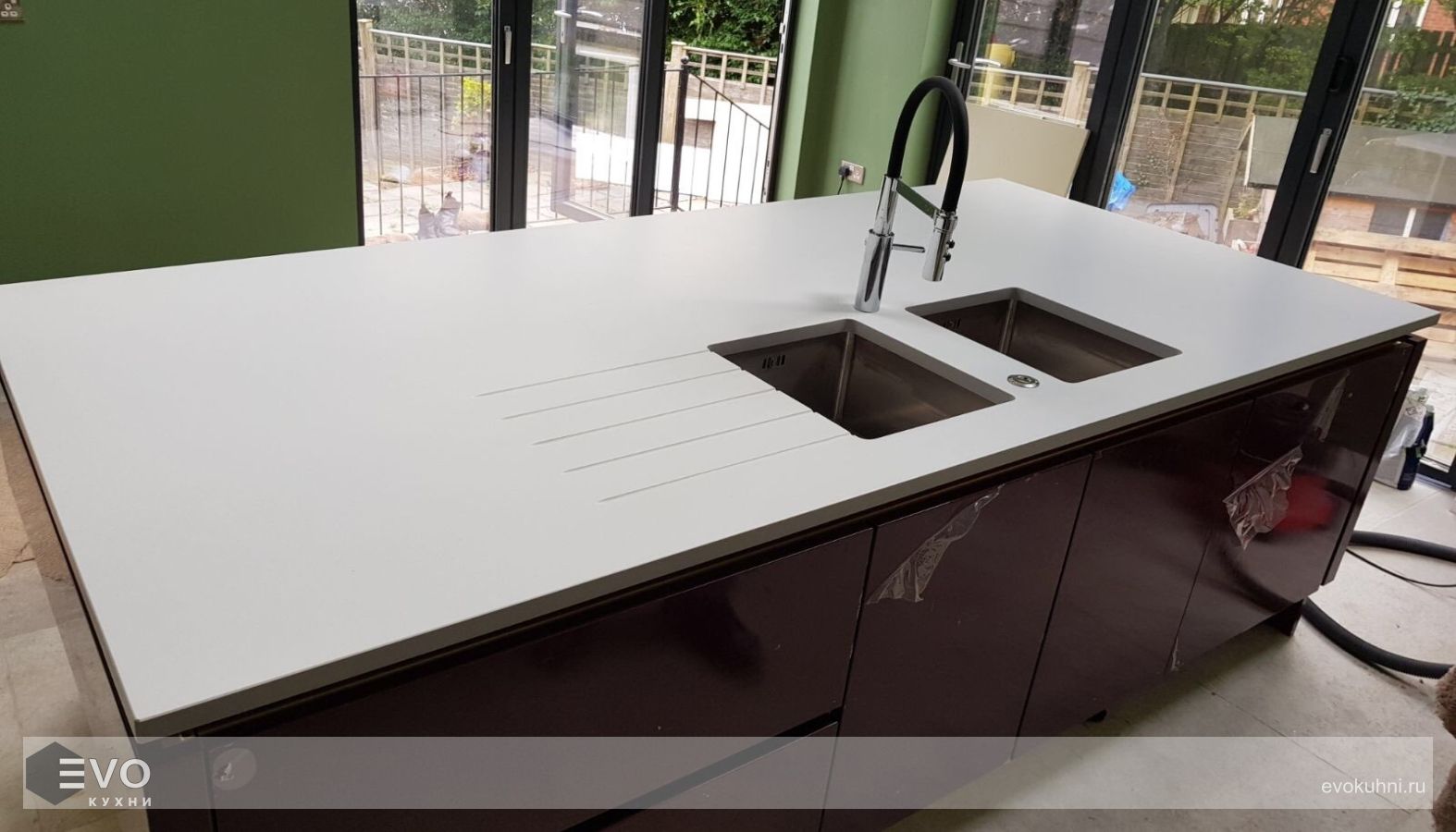 - Благодаря отсутствию пор и микротрещин, поверхность из кварца легко мыть водой или обычными моющими средствами, кроме тех, что содержат хлор.